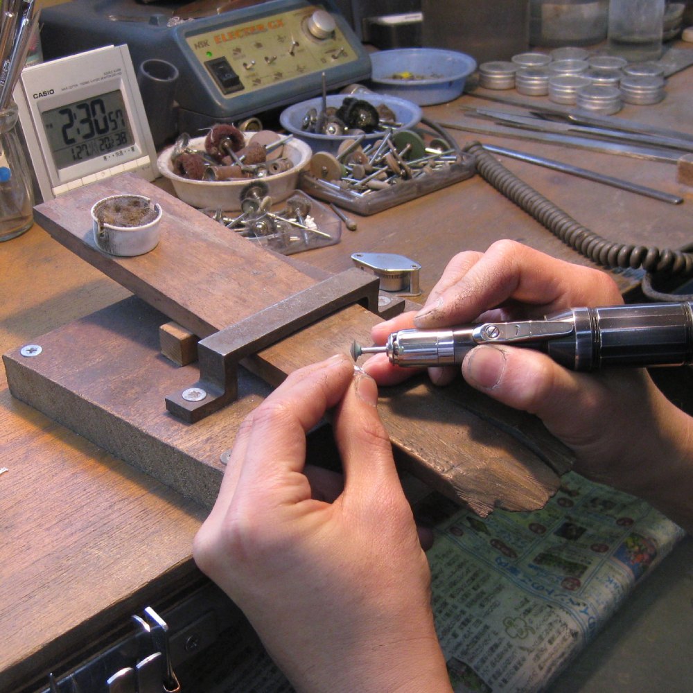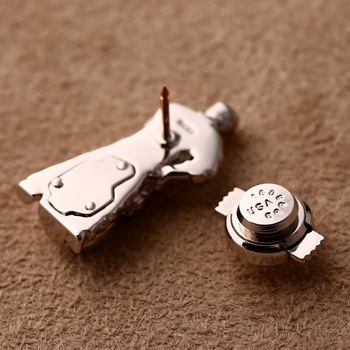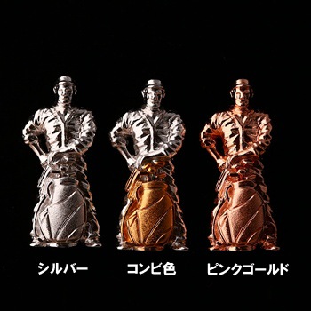 熟練のした職人の技が存分に盛り込まれた2㌢ほどの小さなピン。これだけ小さいのに顔の彫や髪の毛、着ているつなぎのシワまで見れば見るほど精巧な手仕事に驚かされる。