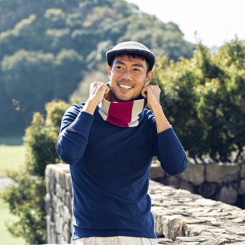 鮮やかなネックウォーマーを首元にプラスして、コーディネートのアクセントに。