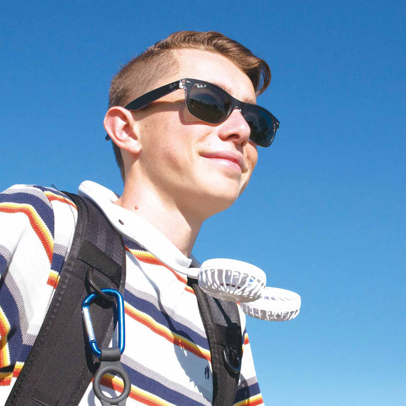 暑くても大好きなゴルフがしたい!そんなゴルフファーに向けて、真夏ラウンドを快適する便利グッズをおすすめ。今回は、首に掛けて使えるコンパクトなハンズフリータイプの扇風機だ。
