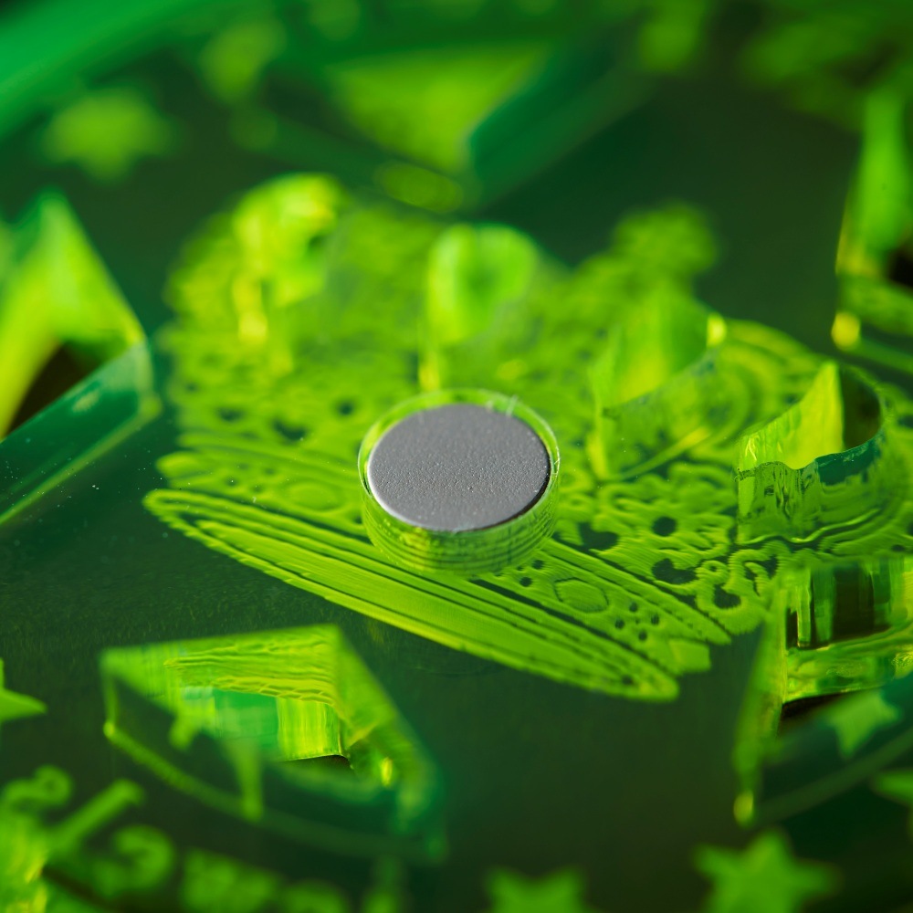 通常は透明色だが、紫外線を浴びると薄紫色に変色する。見失う心配もなく、ちょっとした小ネタにも。