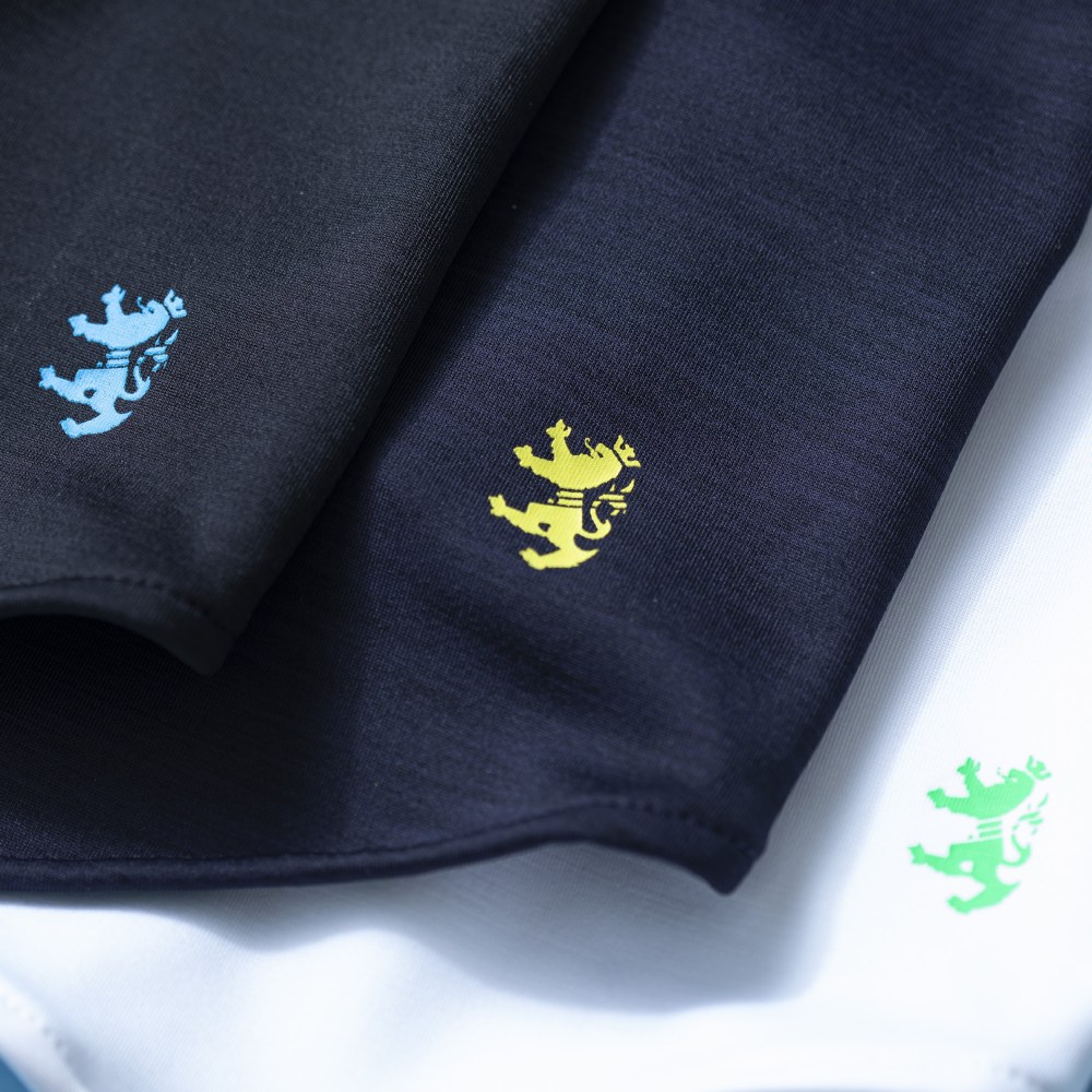黒には水色、紺には黄色、白には緑のロゴ