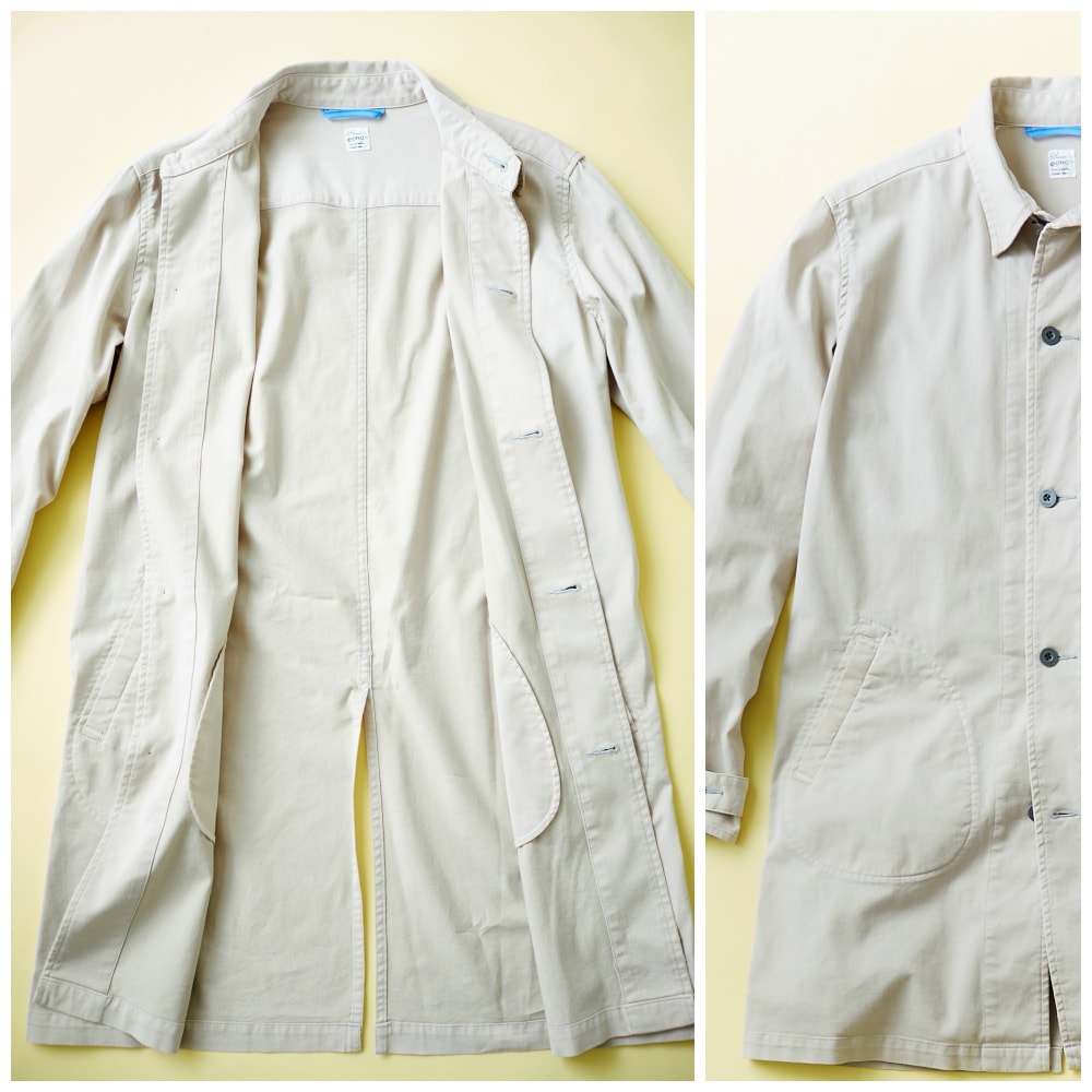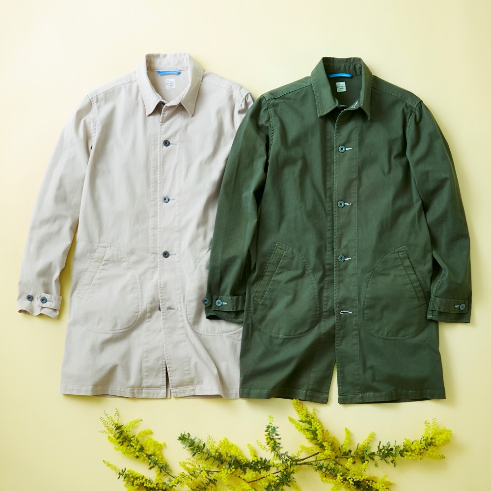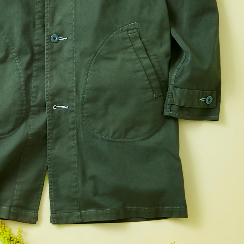 製品に縫い上げて色を付けているので、生地染めと違い、立体感のある色合いに。昼夜の温度差がある春先や秋口にはこの1枚あると重宝するコート。