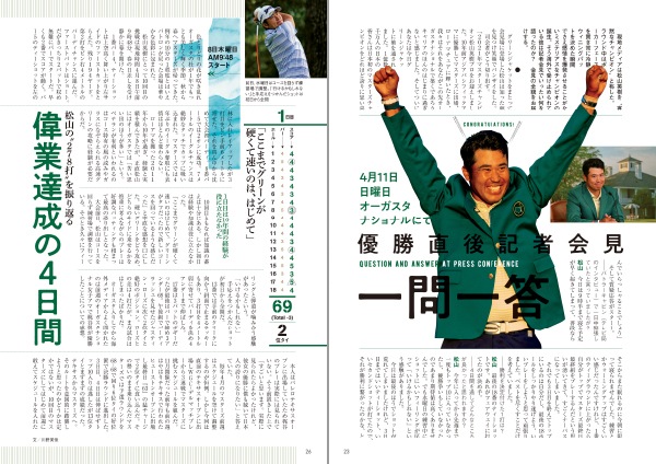 ゴルフダイジェスト誌では、マスターズ開幕前からアメリカで同行取材を敢行。今シーズンからコーチとなった目澤秀憲をはじめとする「チーム松山」の挑戦を追いかけ、さらにマスターズ4日間の「優勝への軌跡」をつぶさにレポート、優勝後の松山の生の声も収録しています。
