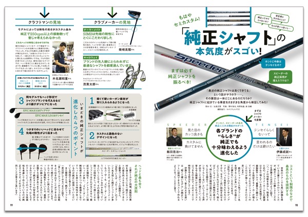 最新モデルのライバル対決や、新旧ヘッド比較、フィッティング最前線、純正シャフトの進化調査など、実際に打って試した企画が満載。話題のスウィング理論「シャローイング」レッスンやフィッティングによる飛距離アップ作新も、実際に試してレポートします。