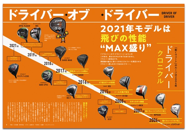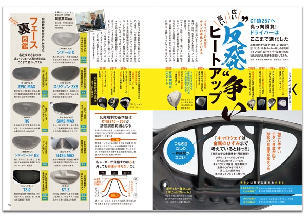 ドライバー20年来の進化の歴史を紐解くとともに、「2つの強弾道 ドローバイアスとロースピンモデル」「『CT値257』へ真っ向勝負! 反発争いヒートアップ」「球筋はどう変わるのか?『動くウェート』の進化を探る」など最新技術をレポート。