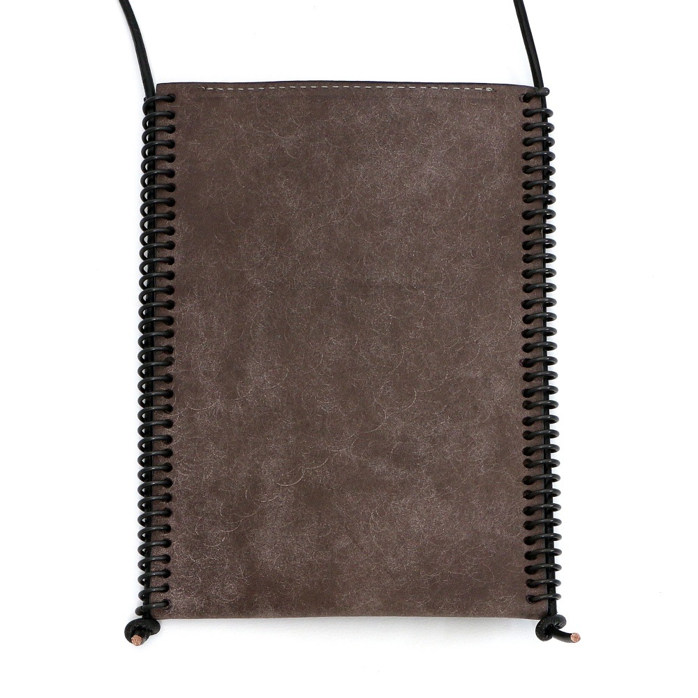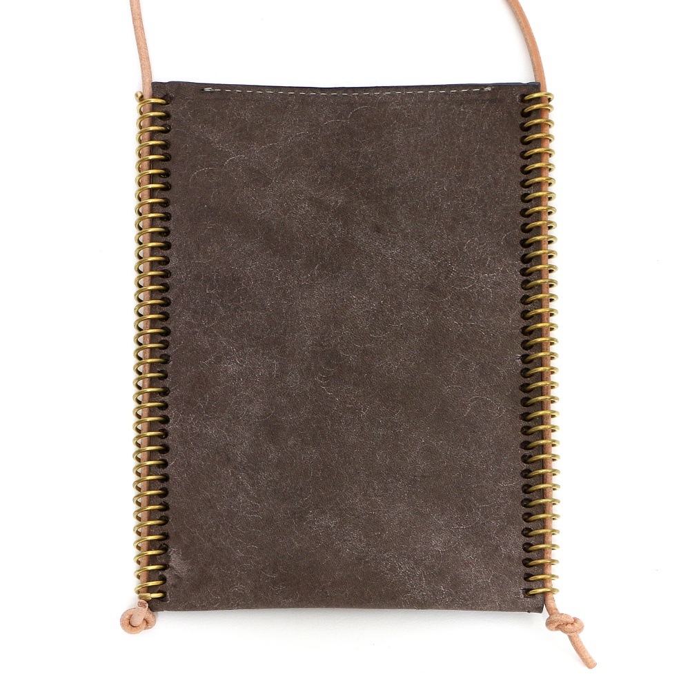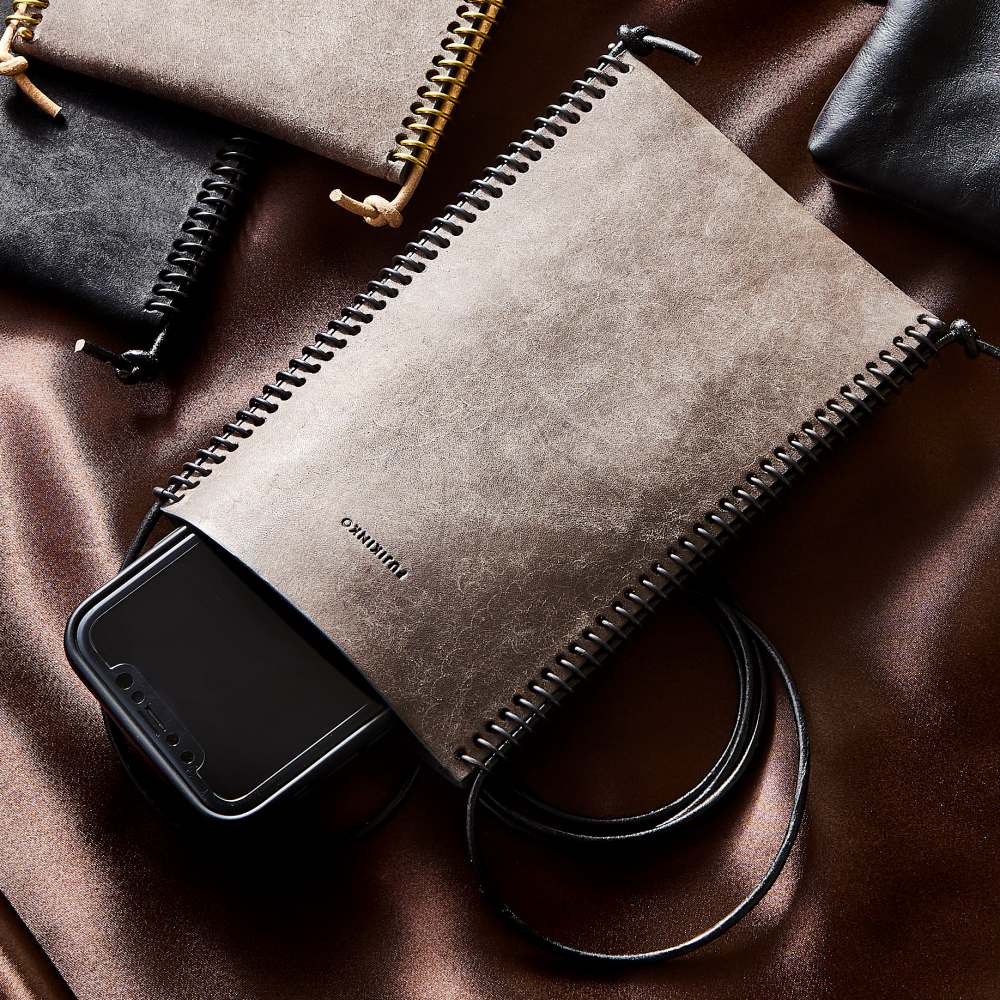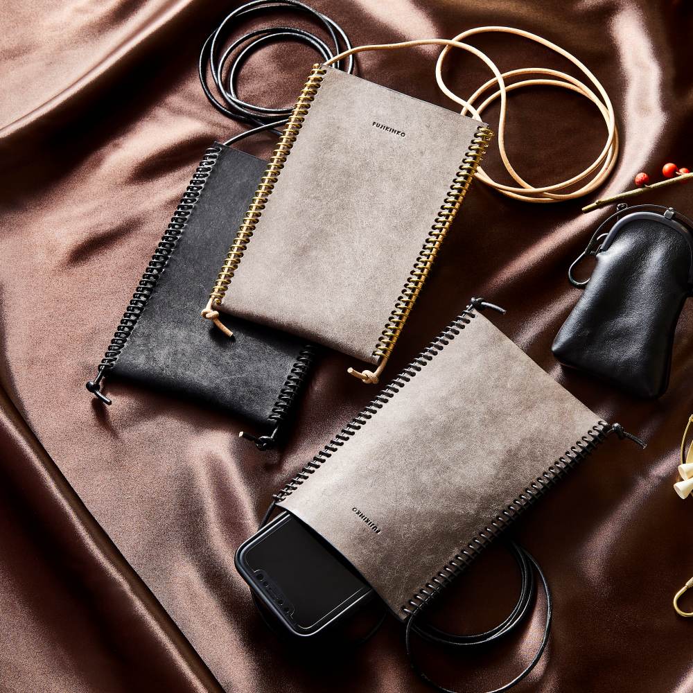 そんな時代の変化に合わせて作られたのがこのスマホ&カードケース。スマートフォンとカード2枚を収納できるショルダーバッグ形状で、本革に70個の穴を開け、真鍮の(しんちゅう)スプリングを職人が手作業で入れています。