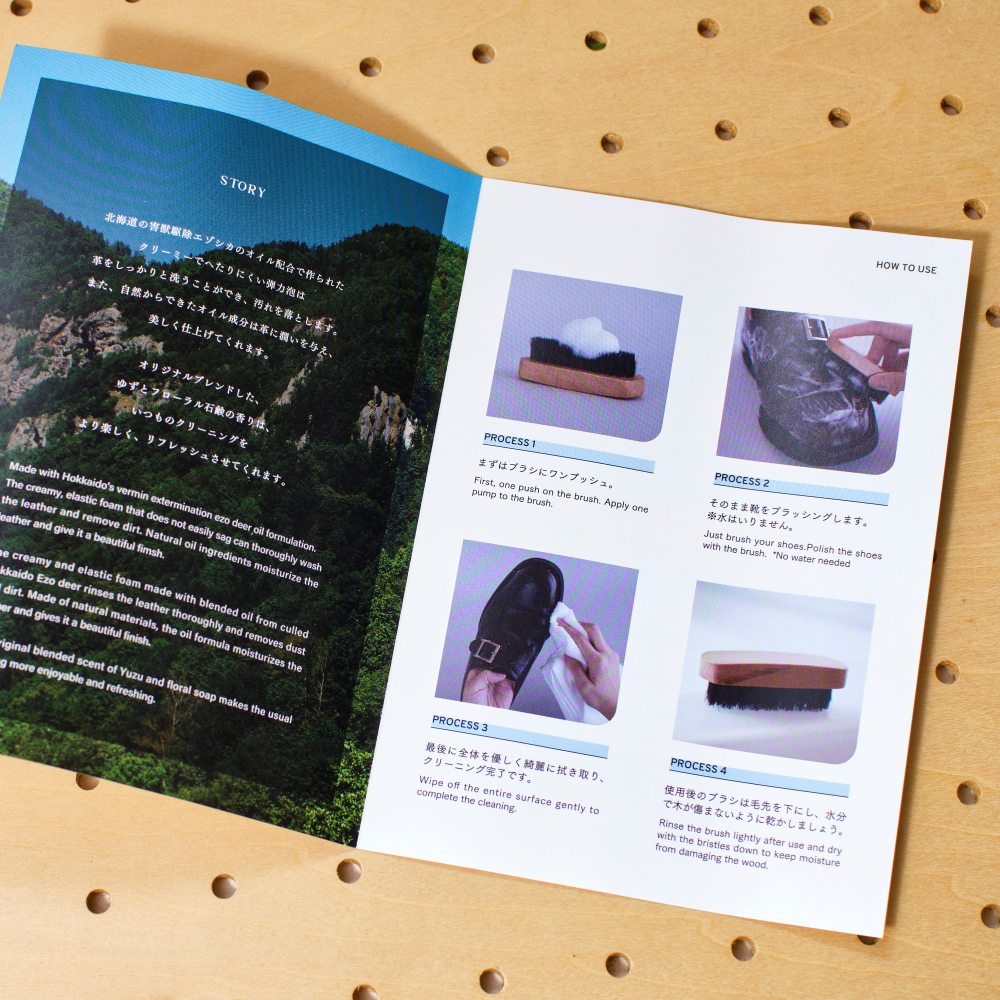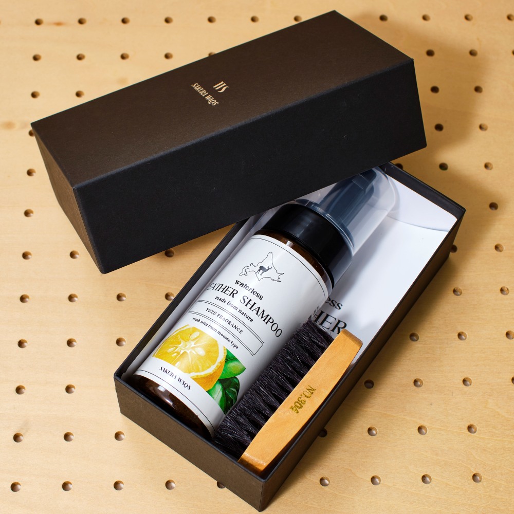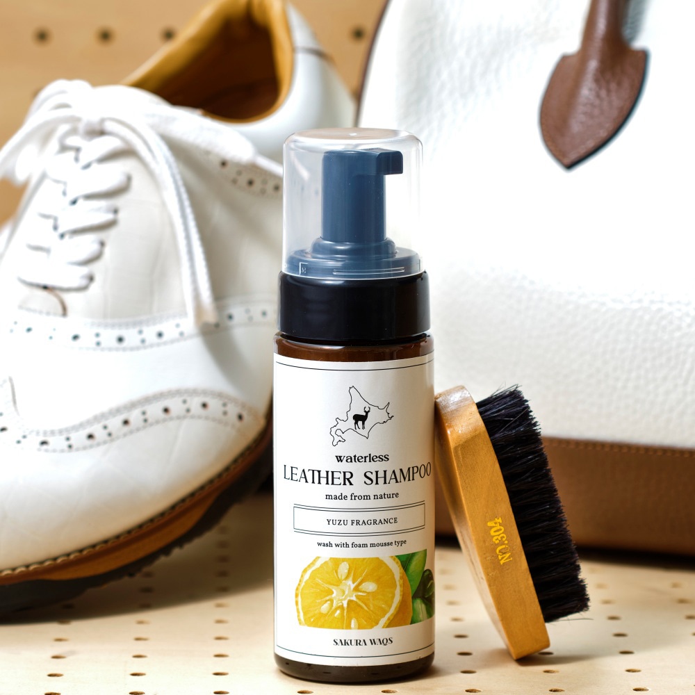 サクラワクスと日本最古の靴クリームメーカーが共同開発した“レザーシャンプー”。北海道の害獣駆除エゾシカのナチュラルオイル成分配合で、除菌作用、保湿作用もあります。柚子とソープのほのかな香りで、靴などのいや~な臭いも一層してくれる優れものです。天然由来のオイル成分でSDGs、環境にやさしいのも◎