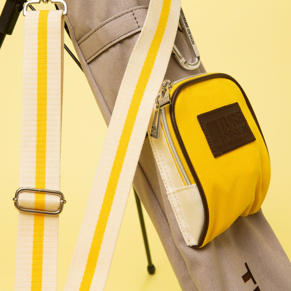 このターフデザインのミニスタンドバッグには、ラウンドで使用する際に助かる機能が搭載されています。まず、ティやボールなどを入れる小物を収納できるポケットがあるのがうれしいところ。カラビナも装着されているため、さらに収納を増やすことも可能です。