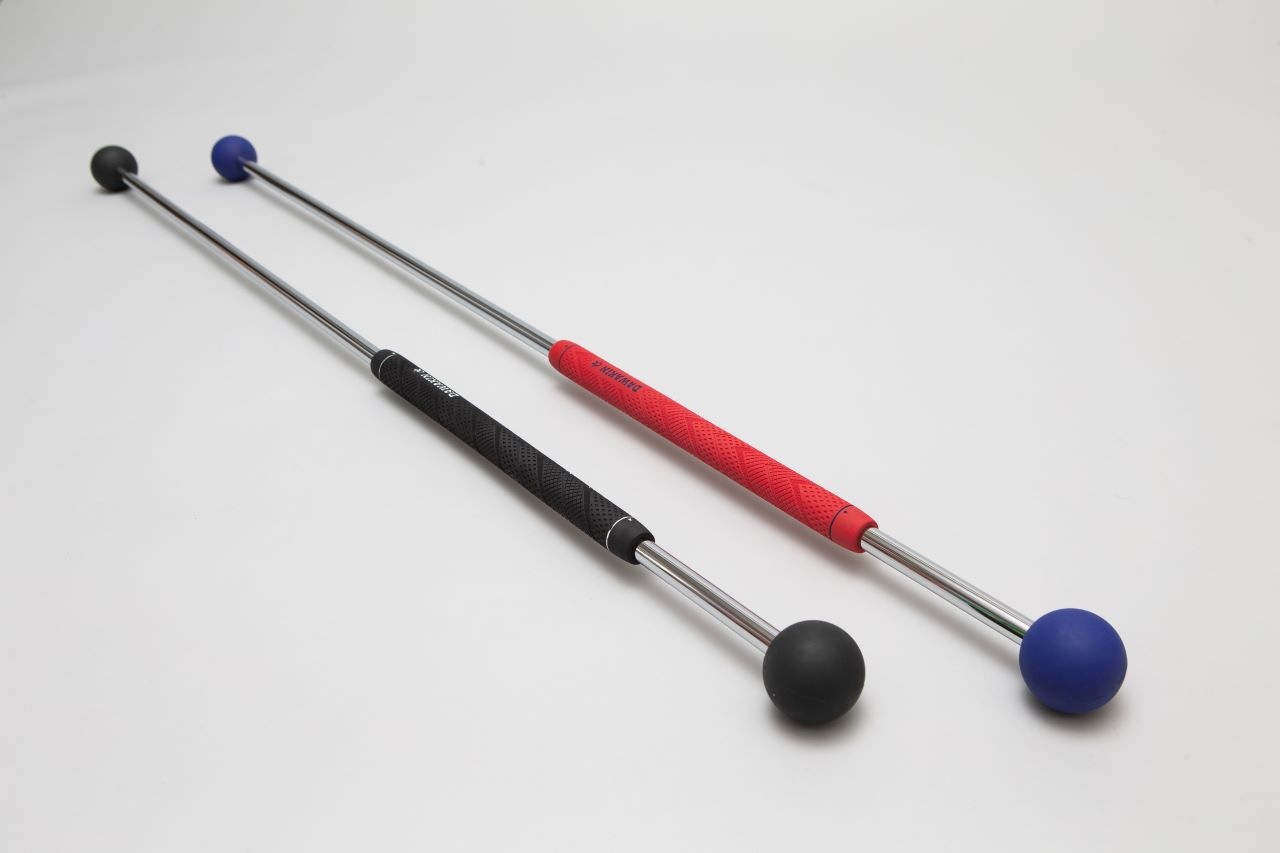 ダワ筋スティック。重たいシャフトに長いグリップと、両端に“パワーボール”が取り付けられた素振り用練習器具だ