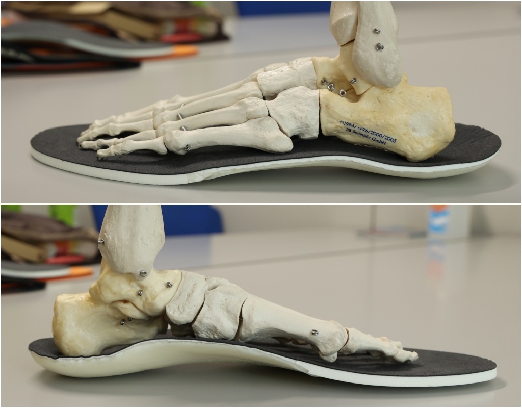 下の写真は足の骨格模型を既製品のインソールに合わせたものです。小指側と親指側の両側から見ても分かるように、足裏とインソールはピッタリとくっついておらず、隙間がたくさんあるのが分かります。