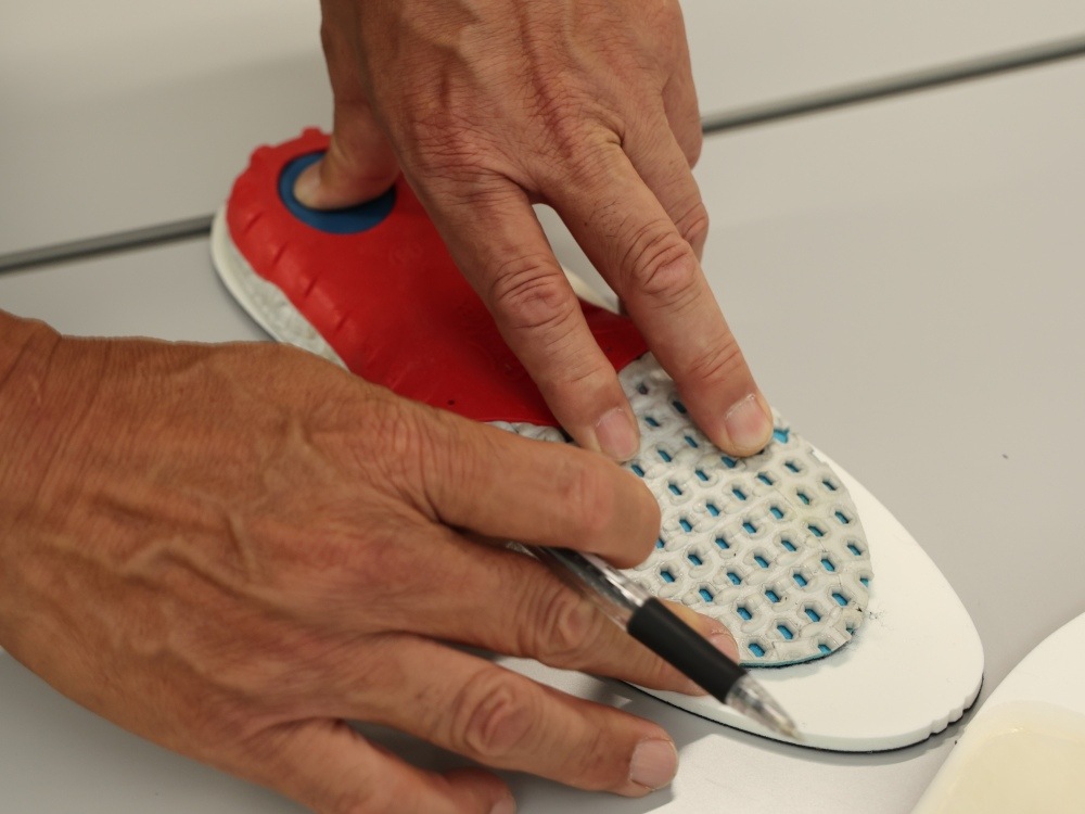 ⑦軟らかくなった樹脂部分に市販のラップを引き、カップインソールになるようシューズにはめ込む