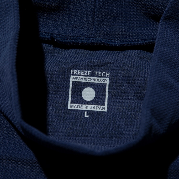 汗と風で冷感が持続する「フリーズテック」加工生地。裏面前面に特殊な冷感プリント処理をした生地が、水分(汗)を吸収すると、その急熱特性により、生地温度が下がり、冷感を付与。風を受けることで、より冷感を強く感じられる高機能素材です。