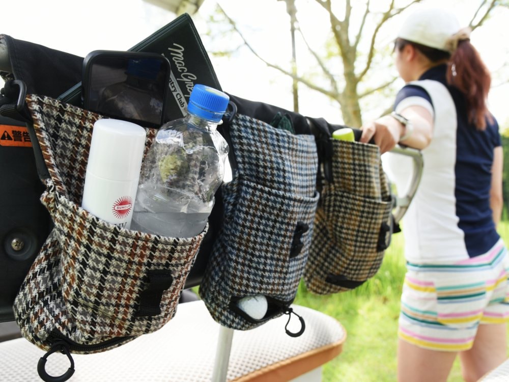 ボールやスコアカード、スマホをひとつに収納して、カートにセット。通常はフタになっている部分を反対側にぐるりと折って、カートの取っ手に巻き付けると使い勝手も格段に上がります。