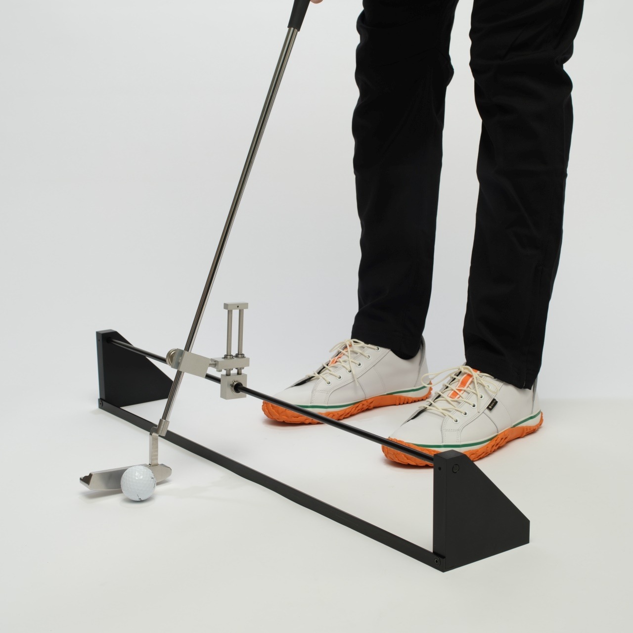LPTは、2本のレールとパターを固定するための治具で構成される練習器具。クラブをライ角通りにセットした状態で固定し、ストロークするだけという非常にシンプルな構造となっています。ただ振るだけで理想のストロークに導いてくれる、それがLPTの長所です。