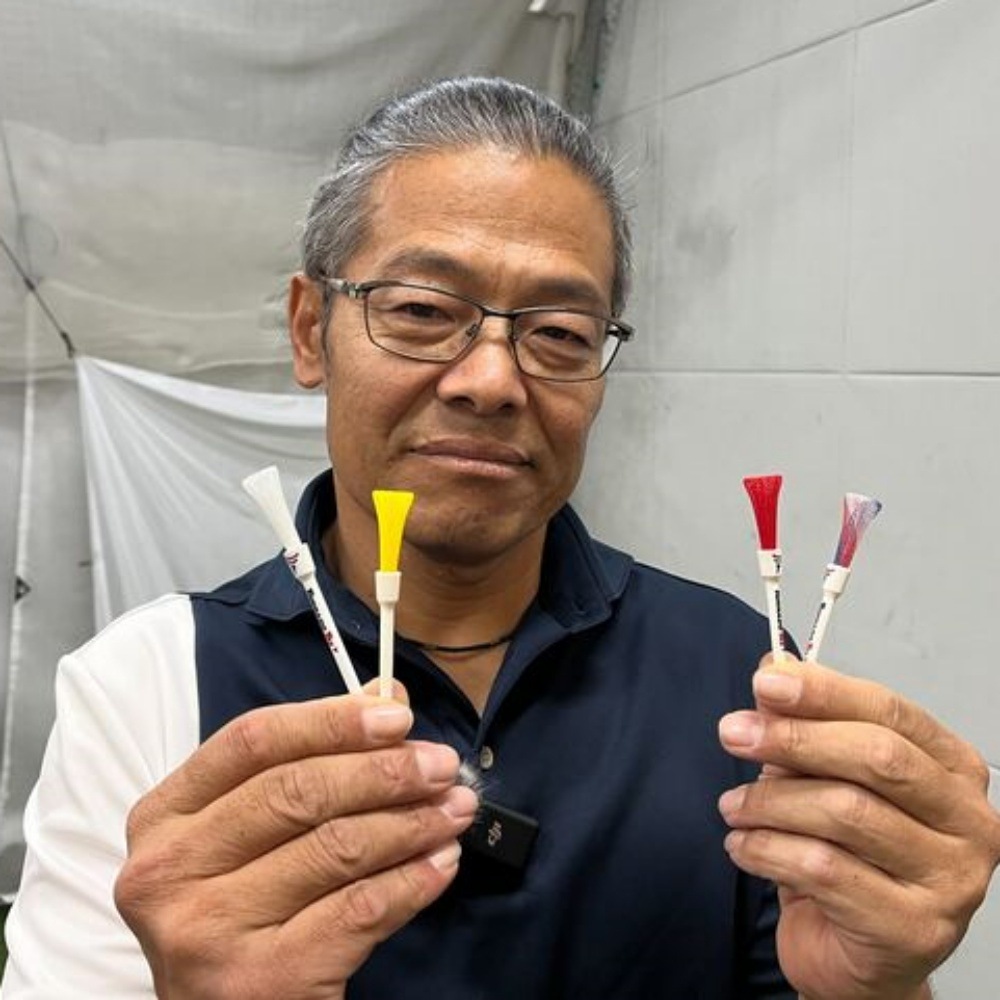 「僕も使っています。世界大会ではロングドライブのドラコン選手はほぼみんな使っています。自分の高さに調節できて、ナイロンで丈夫にできているんだけどインパクトする時に抵抗が少なく、ロースピンになる。僕らは1ヤードでも飛べばいいと思っているので、これを使っています。簡単に300y笑。スピンがちゃんと減る。例えば、コンペのドラコンホールとか「ここは飛ばしたい」という時に使ってもいいと思います。」(山崎泰宏プロ)