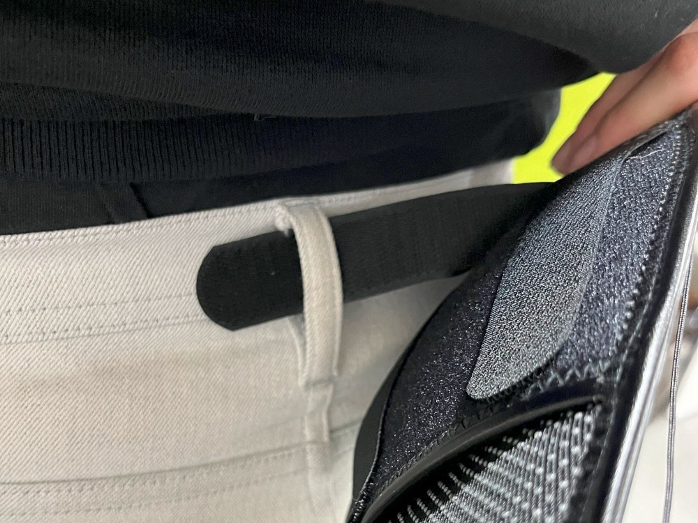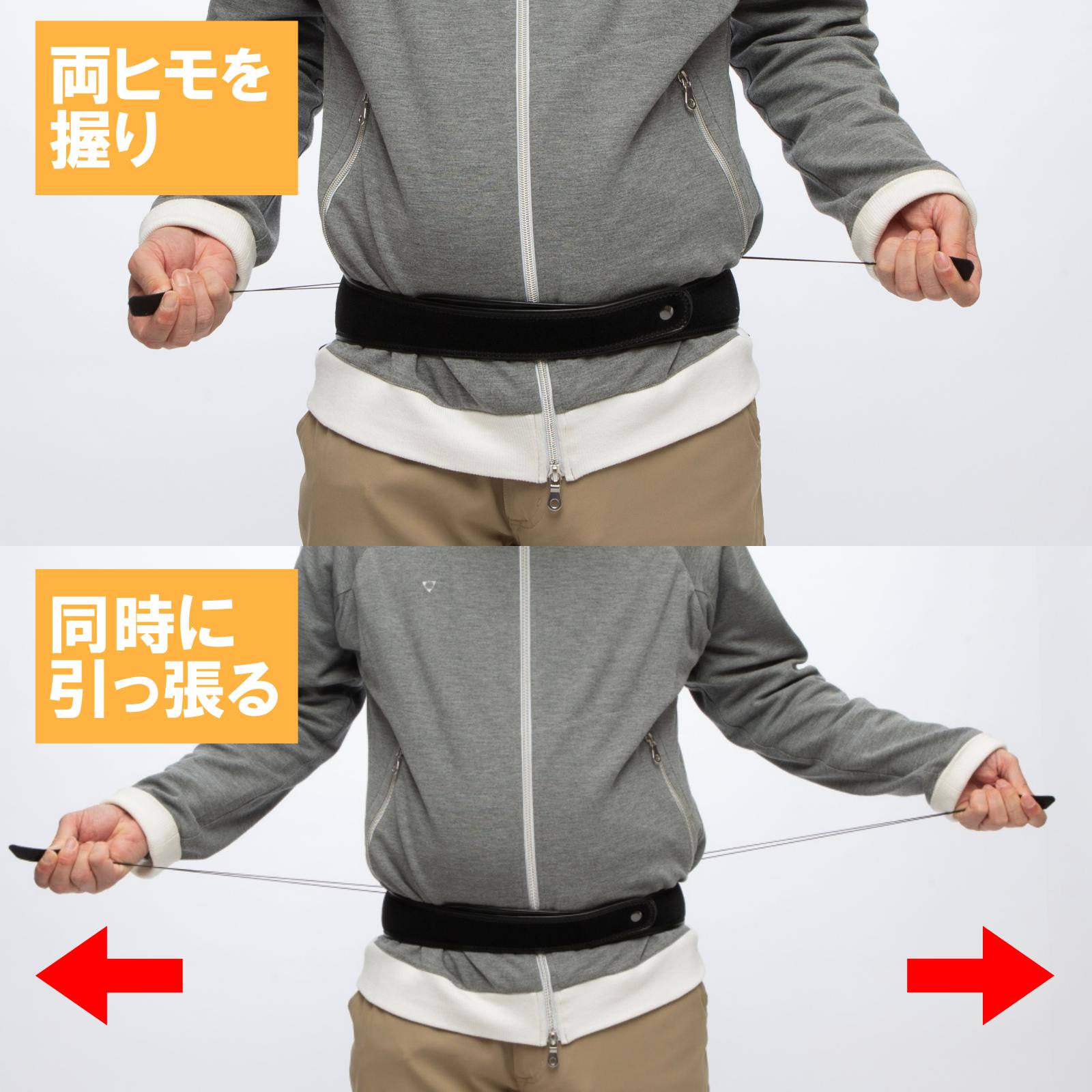 2.両側の引手を持ち、胸を張りながら左右に引っ張り、適度な強さの状態で引手のベルクロをベルト本体に張り付け固定します。