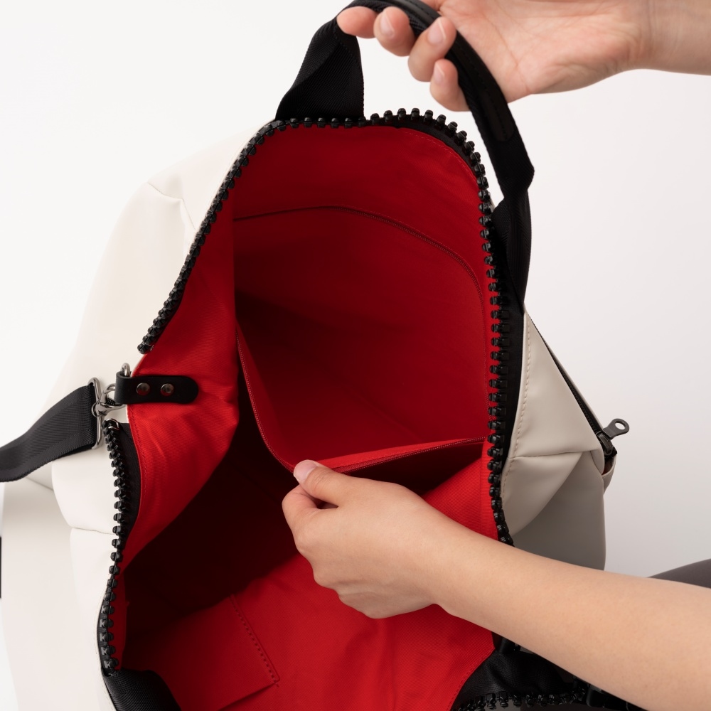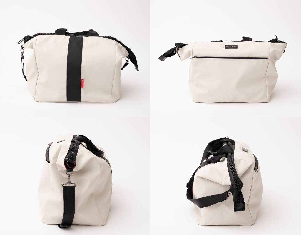 デザインのアクセントになるビッグジッパーを使用した2WAY仕様のボストンバッグ