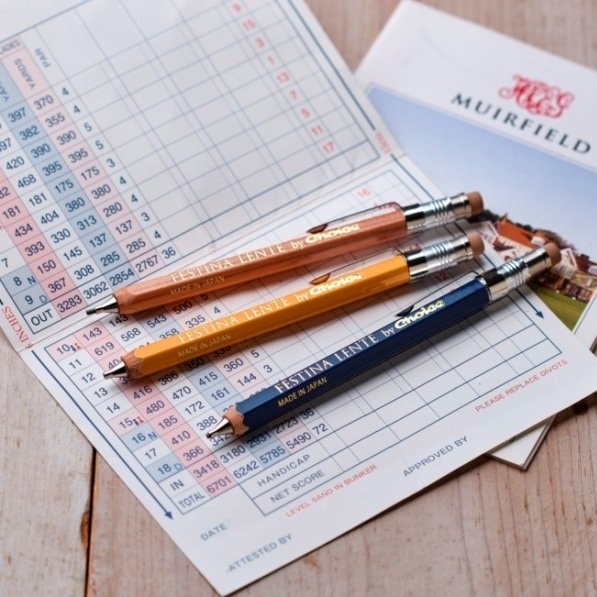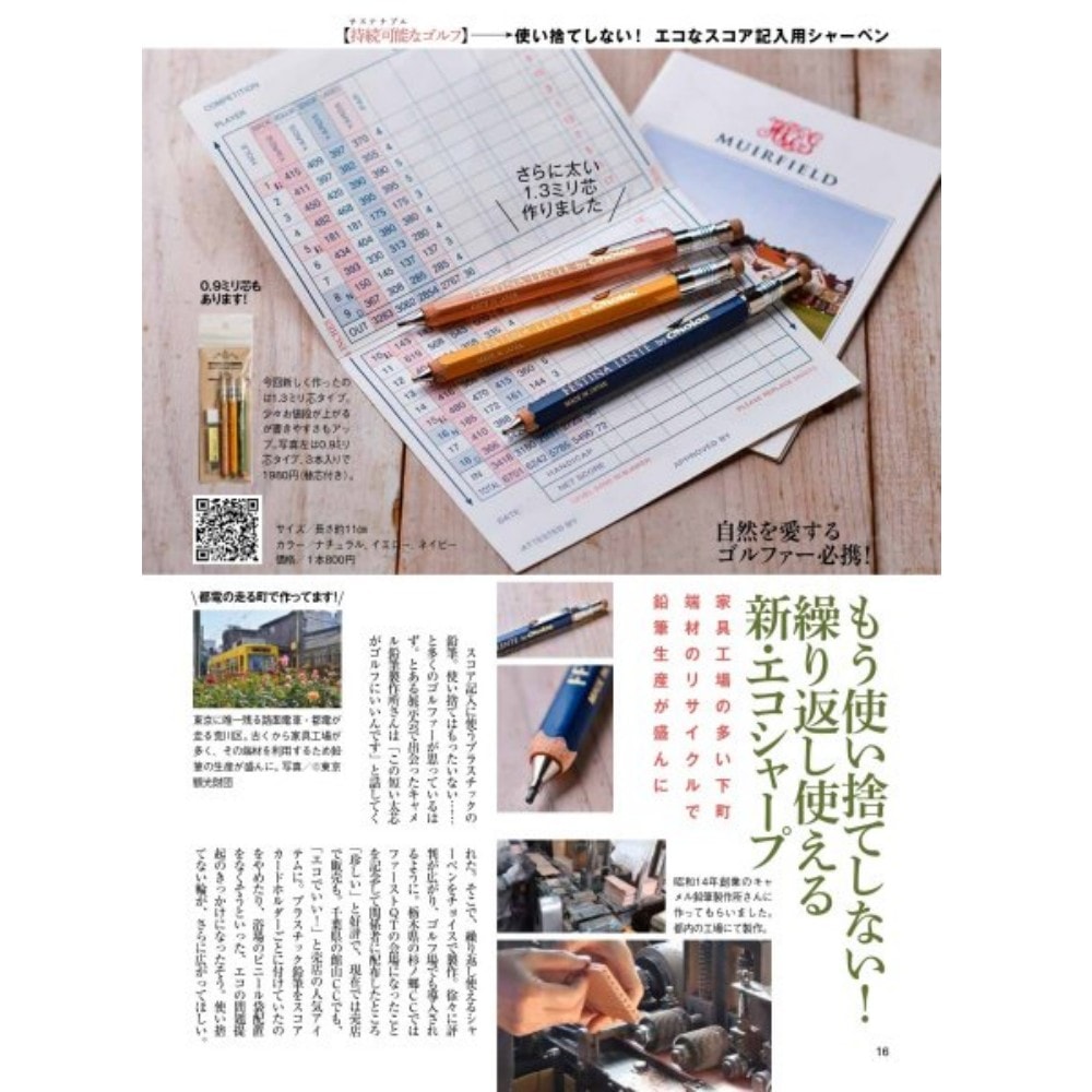 スコア記入に使うプラスチックの鉛筆。使い捨てはもったいない…… と多くのゴルファーが思っているはず。とある展示会で出会ったキャメル鉛筆製作所さんは「この短い太芯がゴルフにいいんです」と話してくれました。そこで、繰り返し使えるシャーペンをチョイスで製作。徐々に評判が広がり、ゴルフ場でも導入されるように。 芯が0.9ミリ→1.3ミリと太くなった分、書きやすさもアップ。クリップ付きなのでスコアカードに差して使えるゴルフ用に最適です。自分で使う他、ゴルフ仲間へプレゼントとしてもオススメです。 粋なプレゼントになり、使い捨てない輪が、さらに広がってほしい。