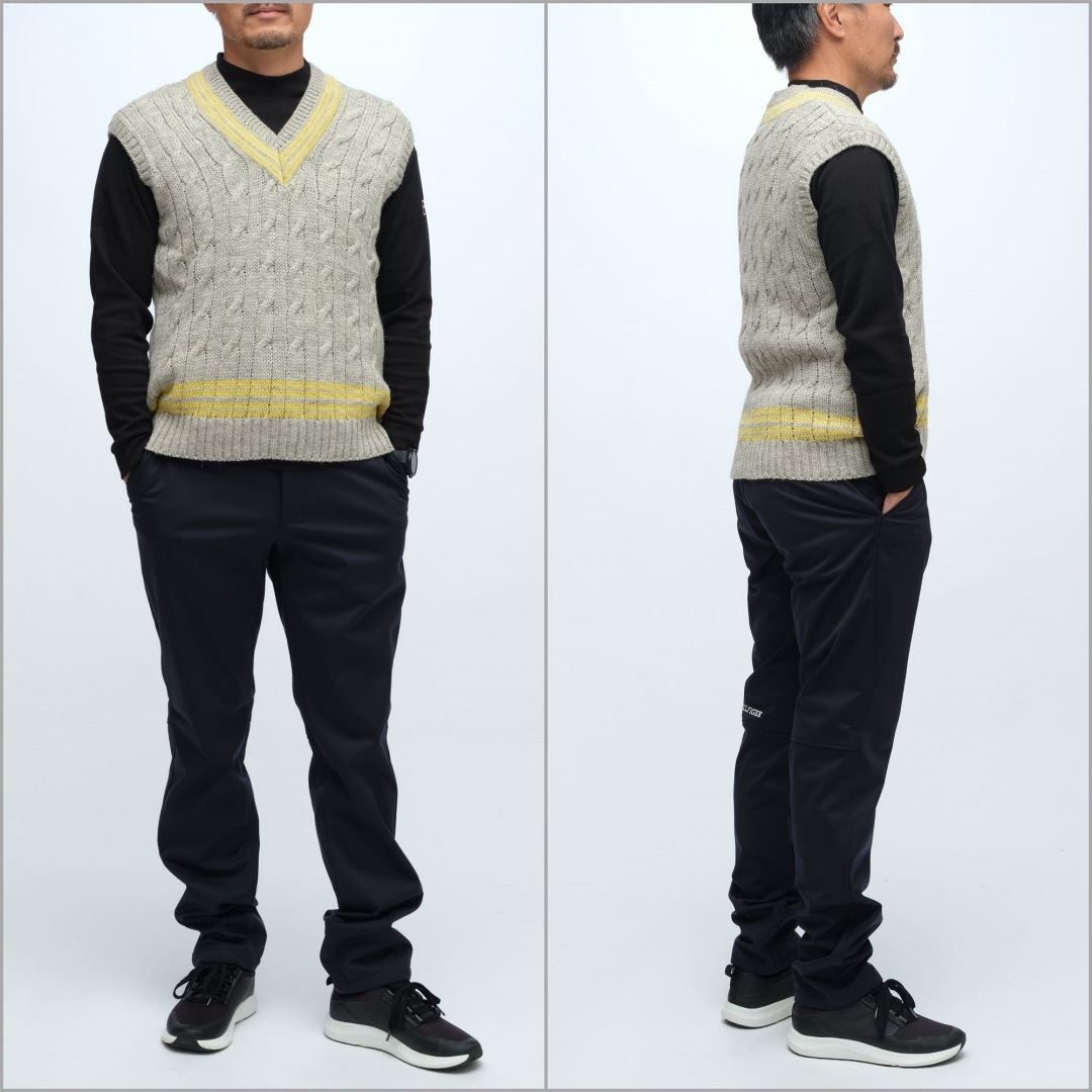 チルデンニットとはVネックの衿や裾にストライプを施したケーブルニットのこと。 ゴルフダイジェストのオリジナル特別配色で作ってもらった。