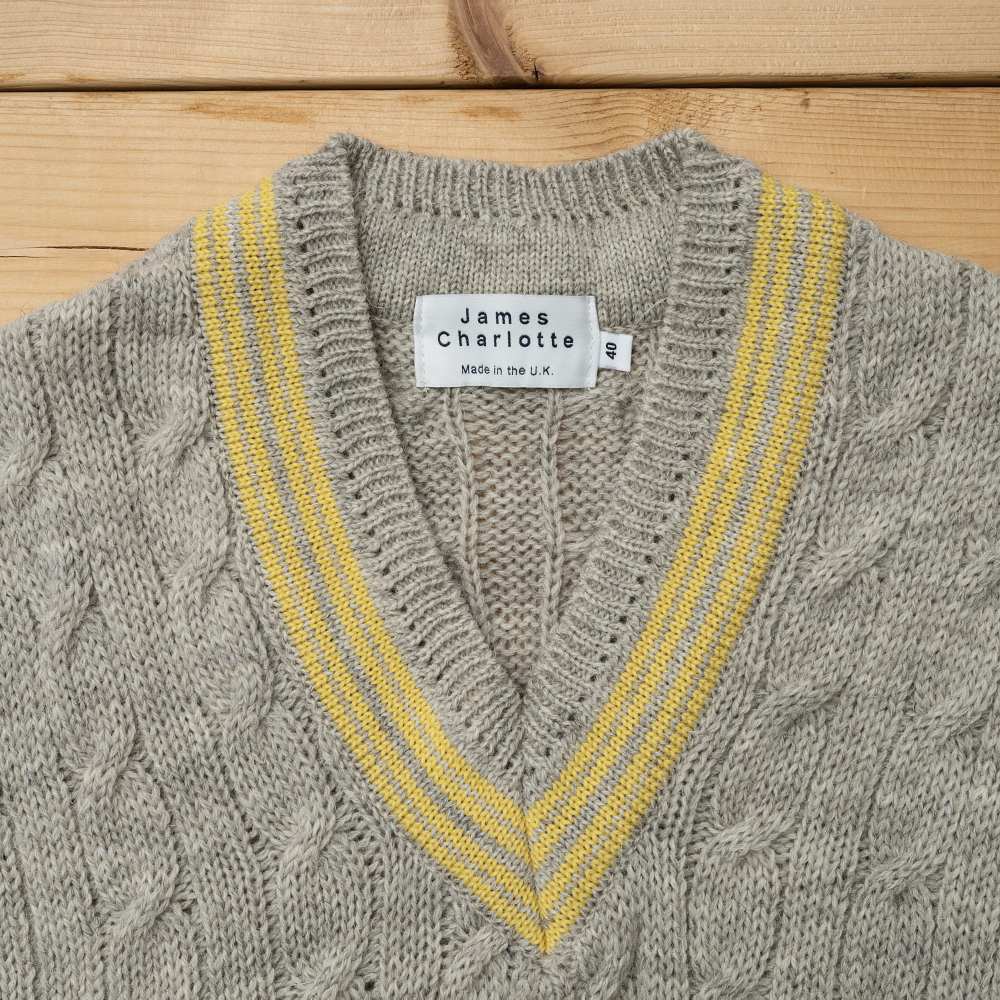 1976年にイングランド北東部・グリムズビーにて創業されたニット専業メーカー「James Charlotte(ジェームスシャルロット)」。手動の編み機であるハンドフレームを使い、ニット職人が一枚一枚編み上げる手法を守り続けている希少なメーカー。自社ブランドの他、高級メゾンのニットウェアも手掛けるなど、技術力の高い伝統的なニットウェアを作り続けている。