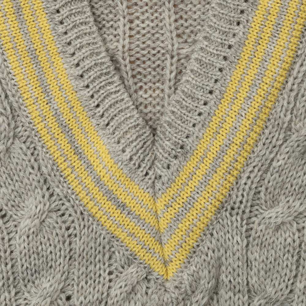 Vネックの襟元は特に機械編みでは出せない、縫い合わせるリンキングの技が見える。