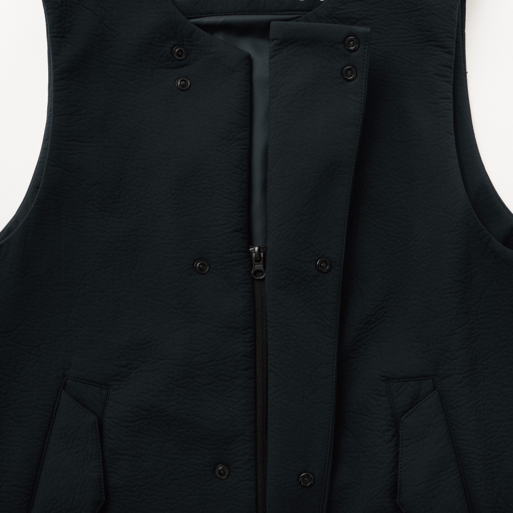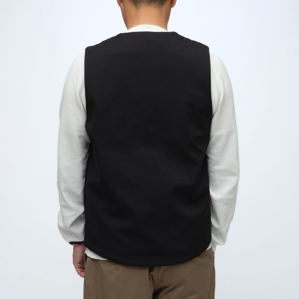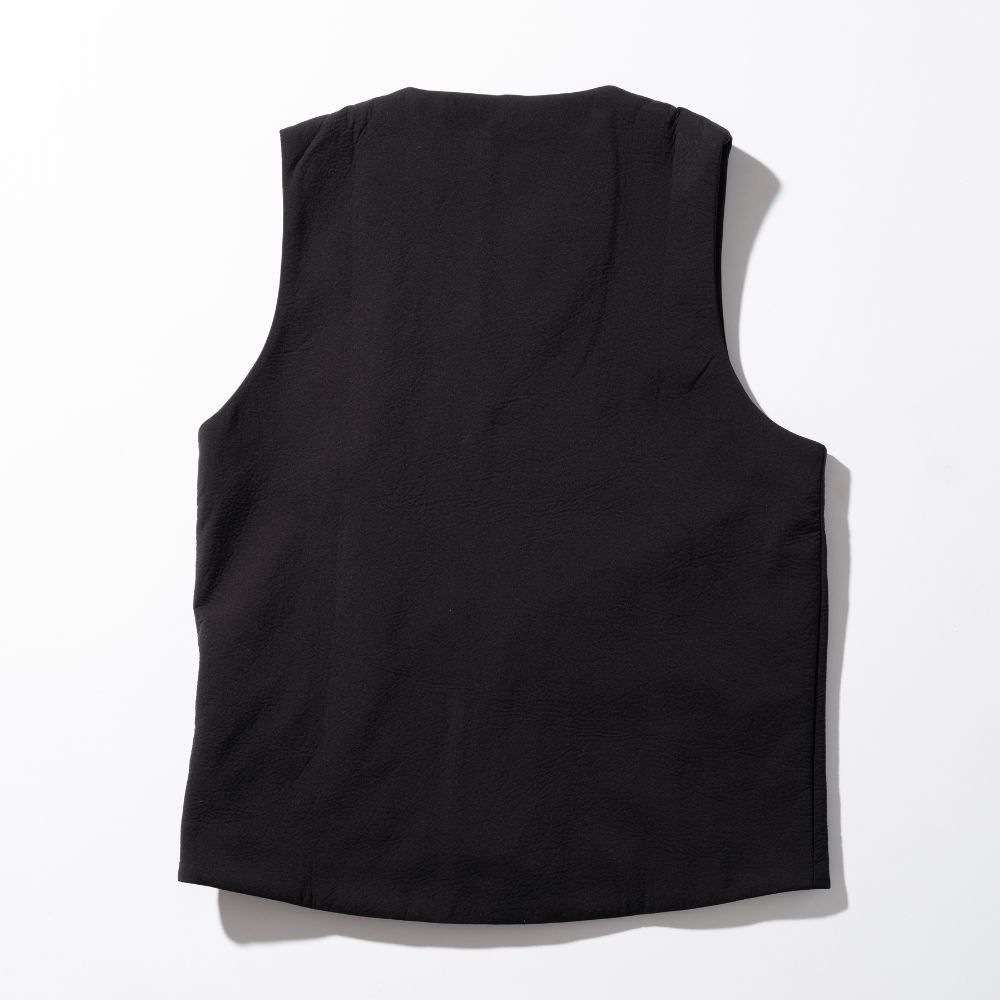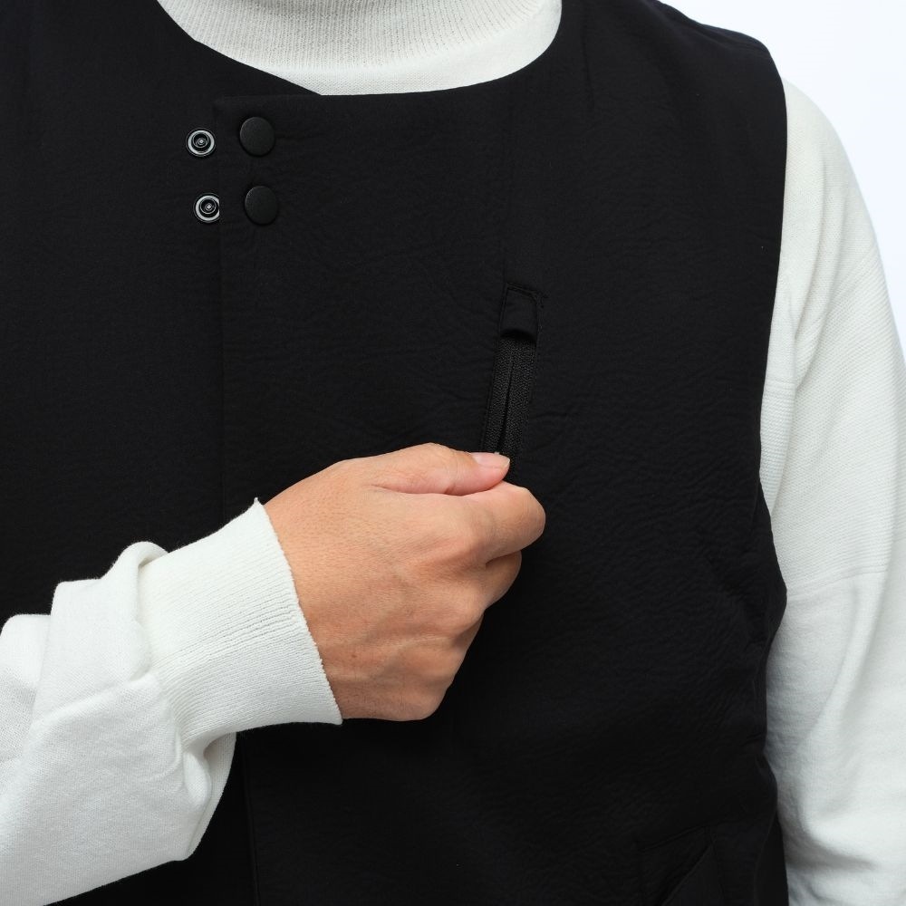 また、大きなポケットにはスナップボタンがついているのでポケットの物を落とす心配はなし。生地の薄さもありすっきりとしたシルエットで着太りしにくく、アウターベストとしてもインナーベストとしても着こなせます。フィット感を高めた設計で、袖がないぶんスウィングへの影響も少なく動きやすさと快適さも両立しています。