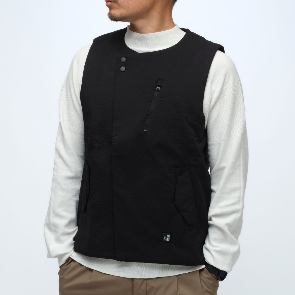 同じEXHEATシリーズの「カーボンヒートベストEH32490」に比べて薄型でデザイン性も高いEH32290。エンボス加工された生地が、全体をよりスタイリッシュに見せています。アウターベストとしてはもちろんですが、アウターの中にインナーベストとして着ればより暖かく着用いただけます。
