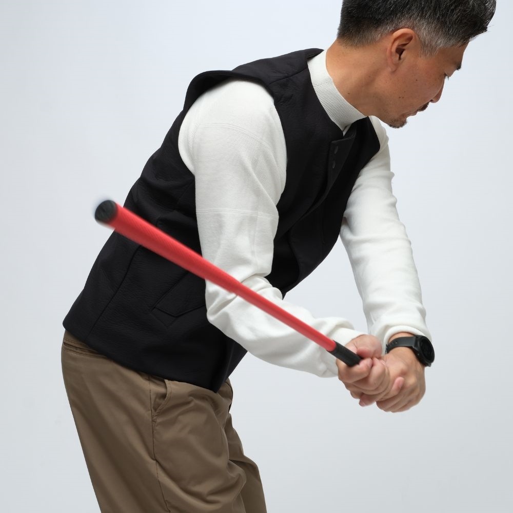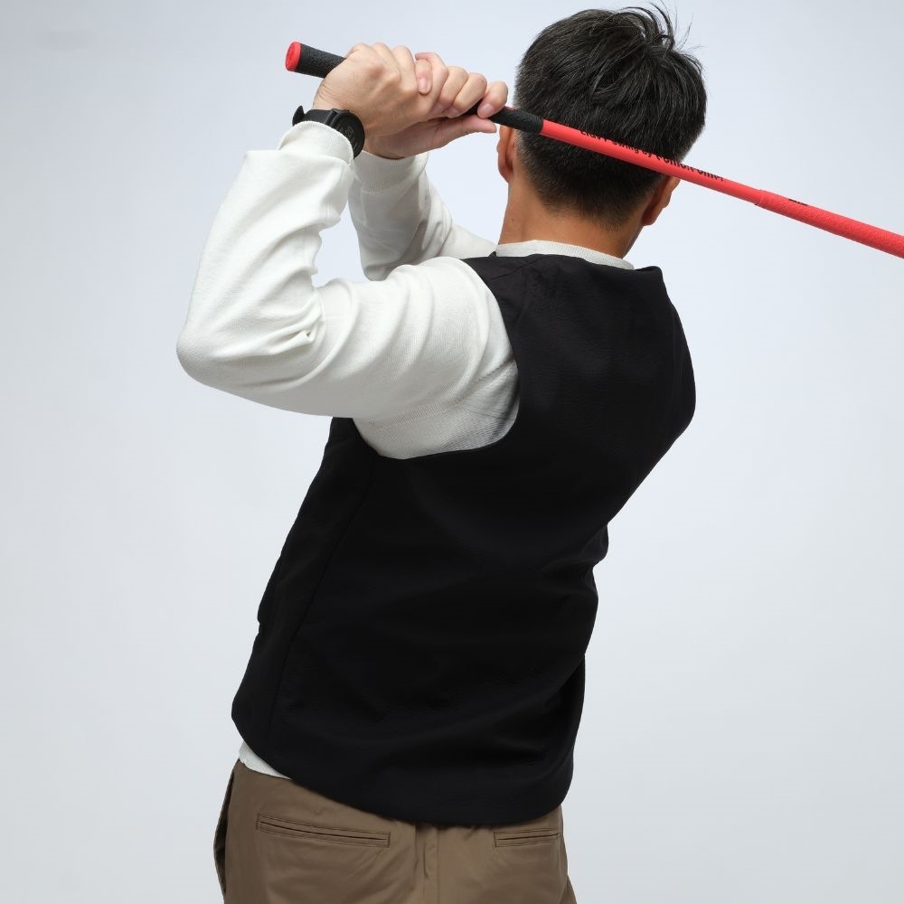 ゴルフ用のベストにはないかっこよさがありますね。Lサイズを着用し、ちょうどよかったと思います。中に着たニットモックネックとの相性は抜群だと思いました。室内での撮影でしたが、電源を付けてみると5分もしないうちに背中がジワっと暖かくなってきたのを感じました。寒い屋外だったらさらに暖かさを感じると思います。スウィングしてみると突っ張る感じもまったくなく、とても振りやすかったです。人によってはポケットに入っているバッテリーが気になるかもしれないですね。
