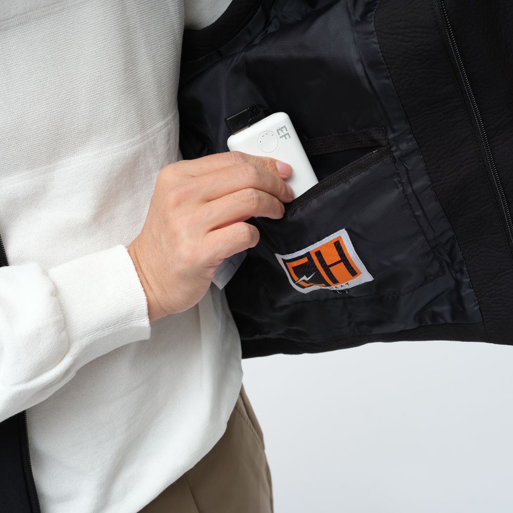 EH32290だけの特徴としては「EXHEAT」と書かれた首の熱源部分。この部分を立てることができ、立てた状態でネックウォーマーをつければ冷たい風が入り込みやすい首元部分も暖かく保てます。また、小物を入れられる胸ポケットがついているのもEH32290だけの仕様です。