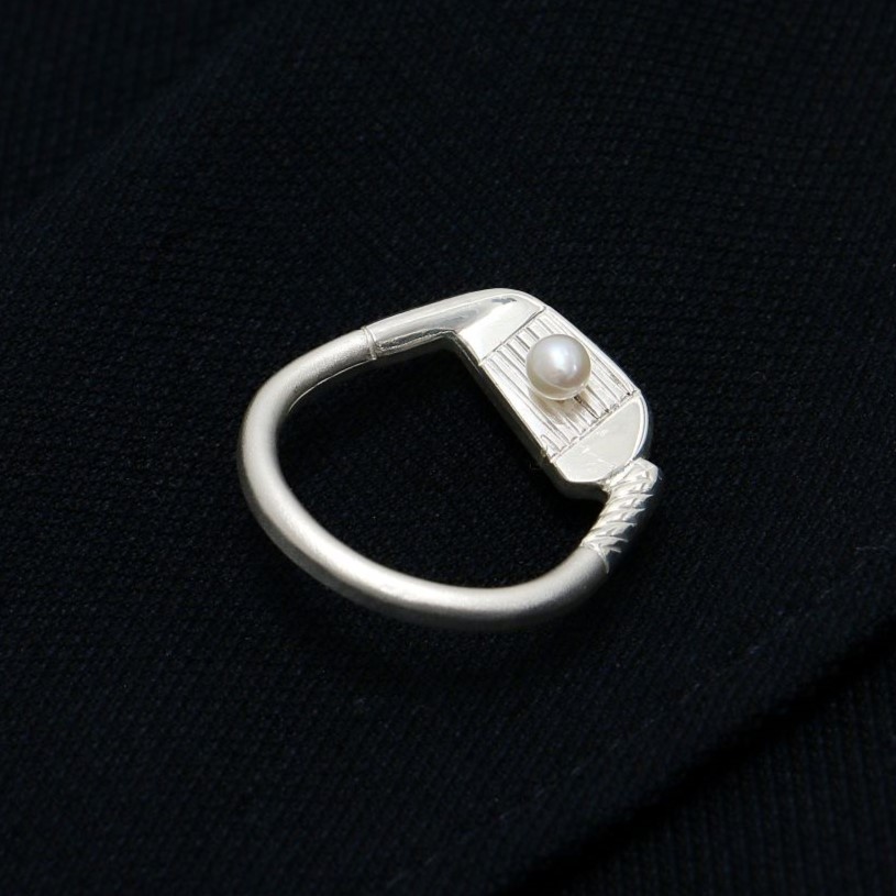 そんな森銀器製作所に特別に作ってもらったのが今回の「ゴルフクラブ眼鏡掛け」。一番に目を引くのが、アイアンフェースにあしらわれたボール部分です。このボールには本物の真珠を使用し、身に着けた人に上品でラグジュアリーな輝きをプラスします。また、シルバーとゴールドの2種類のヘッドカラーから選択可能。どちらも純銀を使用し、高級感あふれる仕上がりです。