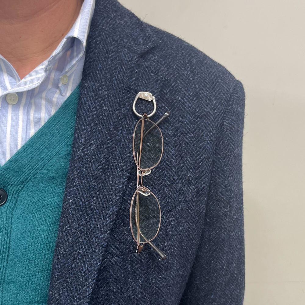 そして、このピンブローチの最大の特徴は、丸い輪の部分に眼鏡を掛けることで、アクセサリーから「眼鏡かけ」という実用性アイテムに早変わりすること。アクセサリーとしてだけでなく、機能美を極めた逸品に仕上がっています。