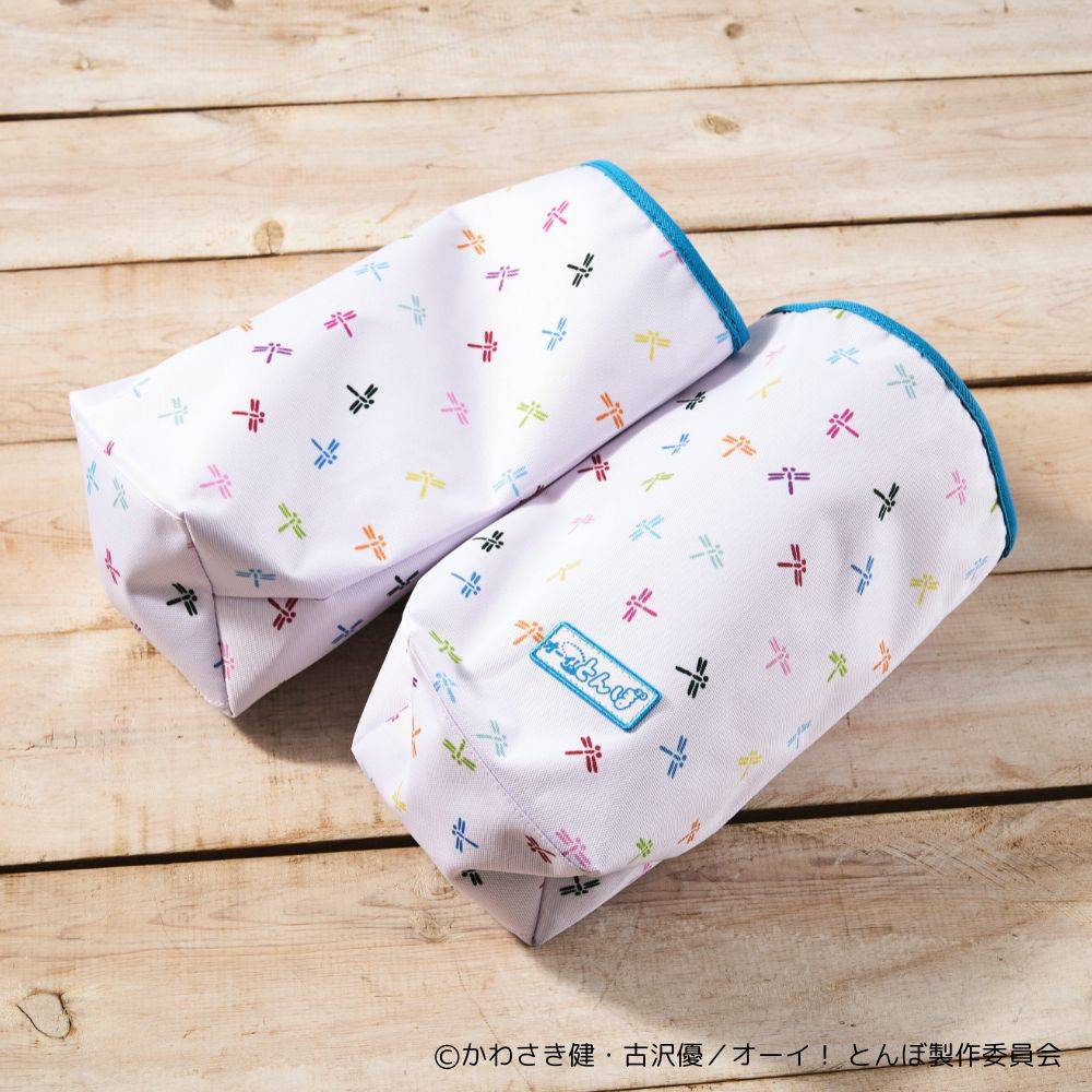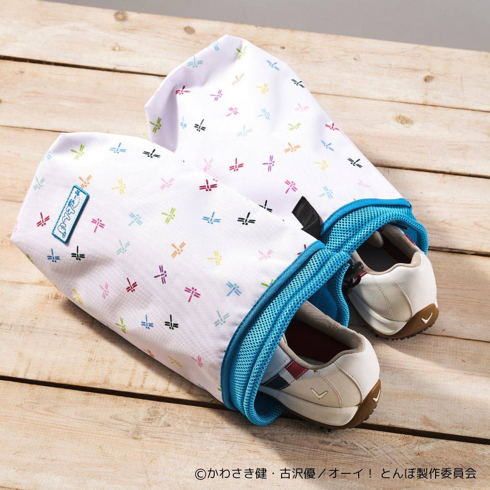 ゴルフライフをもっと楽しく便利に。「オーイ!とんぼ」のカラフルなトンボ柄のモチーフがあしらわれたシューズケースが登場しました!パイピング部分には作品の舞台であるトカラ列島の海をイメージしたトカラブルーをアクセントに、「オーイ!とんぼ」のタイトルロゴパッチが付いていて、デザイン性も抜群。靴を1足ずつ収納できる巾着タイプで、シューズ同士が擦れて傷つく心配がありません。キャディバッグやトートバッグとおそろいで使えば、統一感も楽しめるアイテムです。