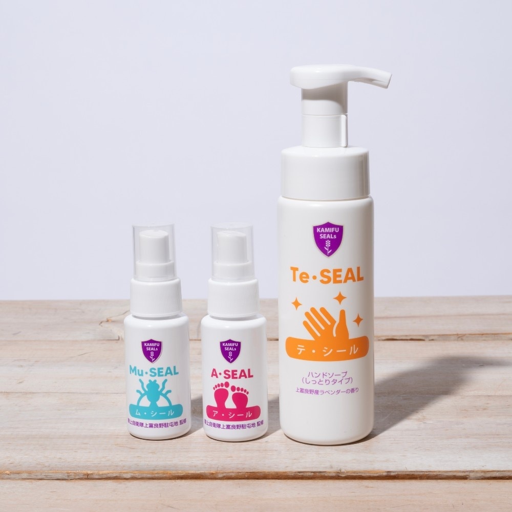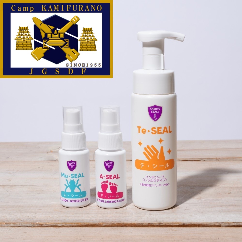 陸上自衛隊・上富良野駐屯地の監修で開発された「KAMIFU SEALs(かみふシールズ)」シリーズが、ゴルフのラウンドでも大活躍!手荒れを防ぐハンドソープ「テ・シール」、汗のにおいを抑える「ア・シール」、虫を寄せ付けにくい「ム・シール」の3つのアイテムで、快適にプレーを楽しみましょう。すべての製品に、北海道・上富良野町の主に「オカムラサキ」という品種のラベンダー製油を贅沢に配合。