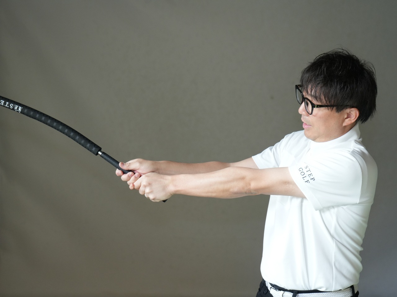 これは、シャフトが大きくしなるタイミングで切り返すということ。タメはクラブと体の捻転差により生まれるもので、これを実際のスウィングで身につけるのは至難の業ですが、フレックスロッドを使えばやすやすと身につけることができるのです。