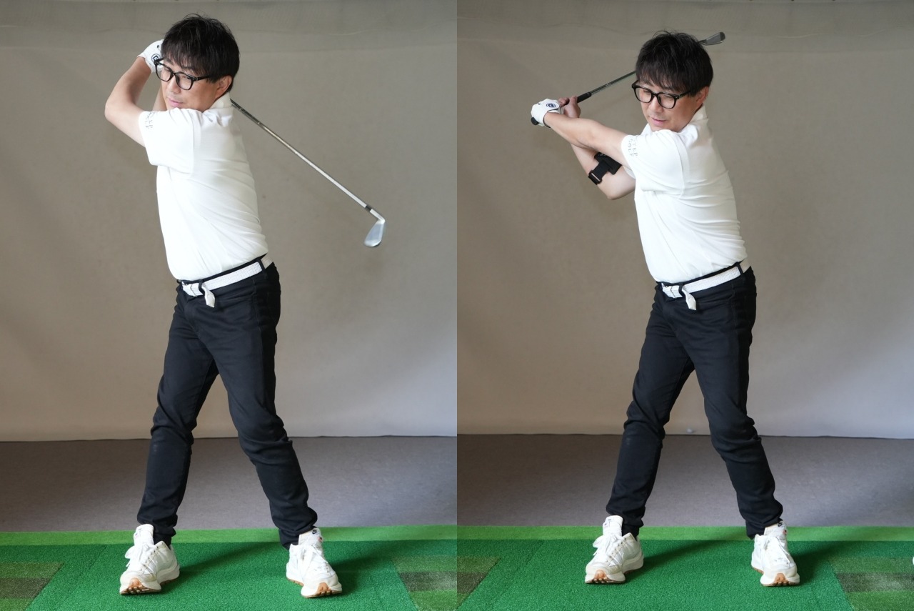 オーバースウィング(左)が、90度キーパーを使えば一瞬で締まったなトップに(右)