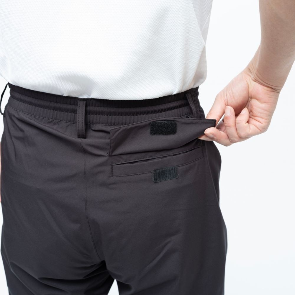ボトムスの裾にはジッパーと調整テープが付いており、雨の侵入を防ぎながら脱ぎ着もスムーズ。加えて、トップスの内ポケットやボトムスのスルーポケット、ベルクロ付きの後ろポケットなど、便利な収納機能も充実しています。細部までこだわった設計で、雨の日でもストレスなくプレーを楽しめるレインウェアです。
