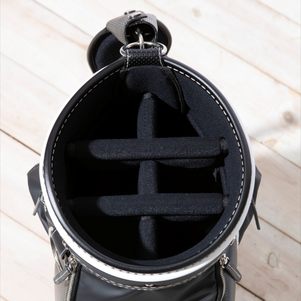 機能性もこれまでの考英舎製のキャディバッグと同様の仕様で、中でも特長的なのがバッグの底部までしっかりと仕切られたセパレート構造です。しっかりセパレートされているので、クラブ同士が引っかかりにくく取り出しもスムーズ。見た目と機能性、すべてを兼ね備えたキャディバッグです。