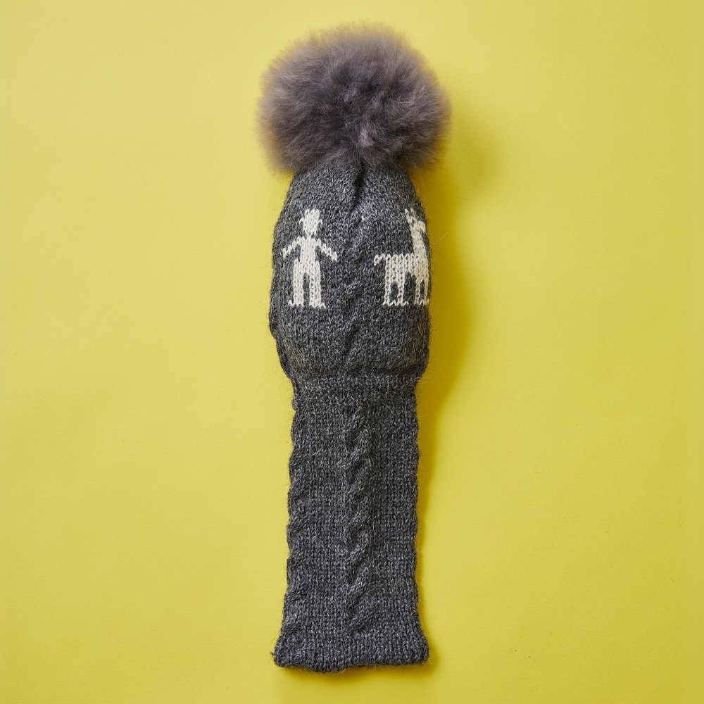 作ってくれたのは日本の縫製技術をもってペルーでの現地生産にこだわる「インポートハウス」。全ての製品をアルパカのメッカ・ペルーの現地にて生産を行っており、また作るアイテムもアルパカ100%であることにこだわりをもつ会社で、ペルー政府から感謝状も授与されている。国際アルパカ協会認定マークのお墨付きです。 かわいらしいアルパカがあしらわれたヘッドカバーはオリジナルでイチから作ってもらったもの。ポンポン部分にはアルパカのリアルファーを使用していて、そのふわふわとした何ともいえない柔らかな手触りは高級カシミヤを凌ぐほど。 そんなふわふわとしたポンポン部分にもアルパカの丈夫さがしっかり出ていて、使ううちにヘタってきたらヘアブラシでとかせばフワッと感がよみがえり、何年たっても新品同様な風合いを楽しめます。
