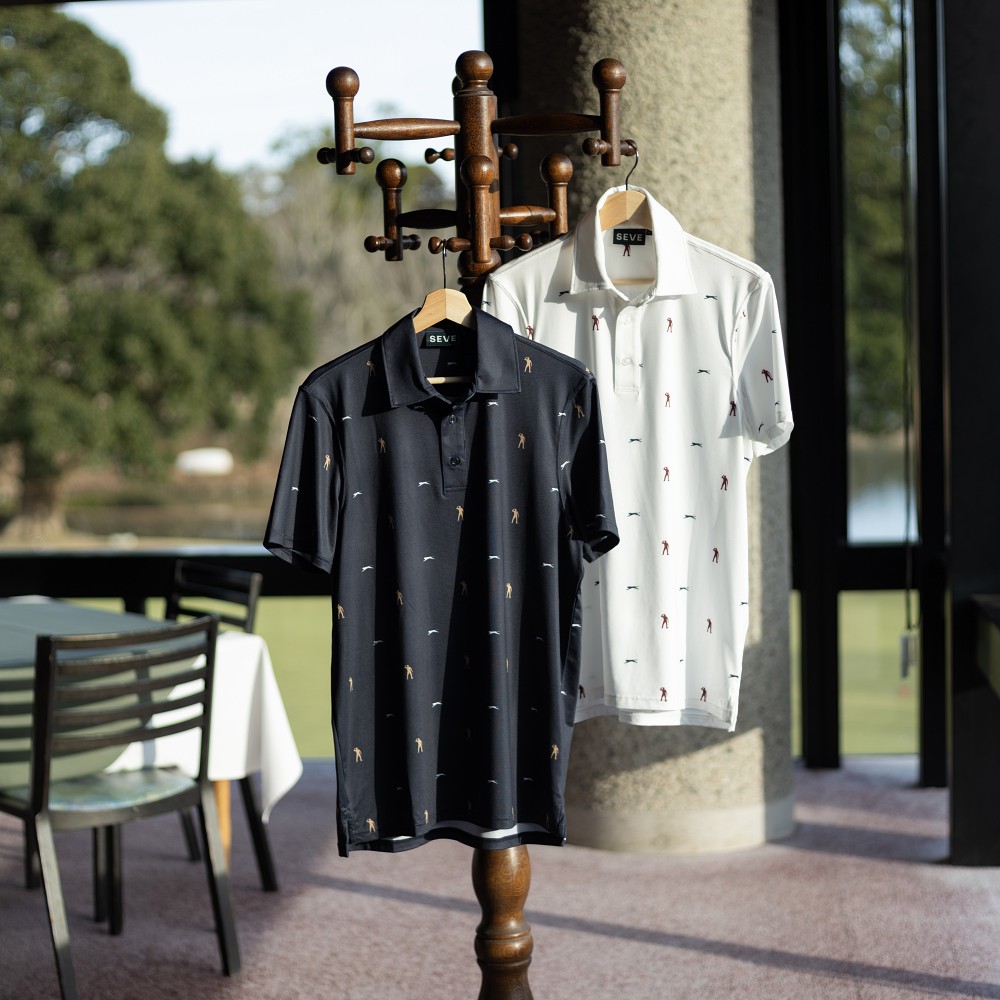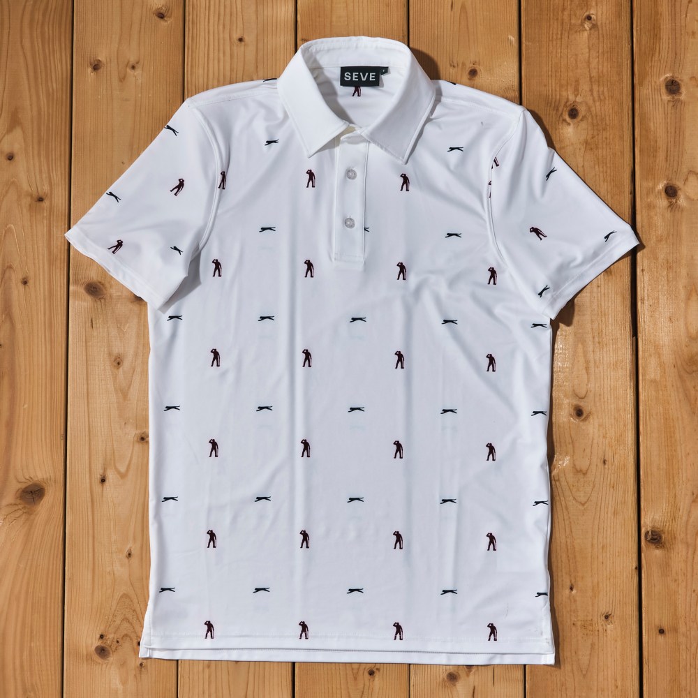 SEVEシルエットロゴ モノグラムポロシャツはネイビーとホワイトの2色展開