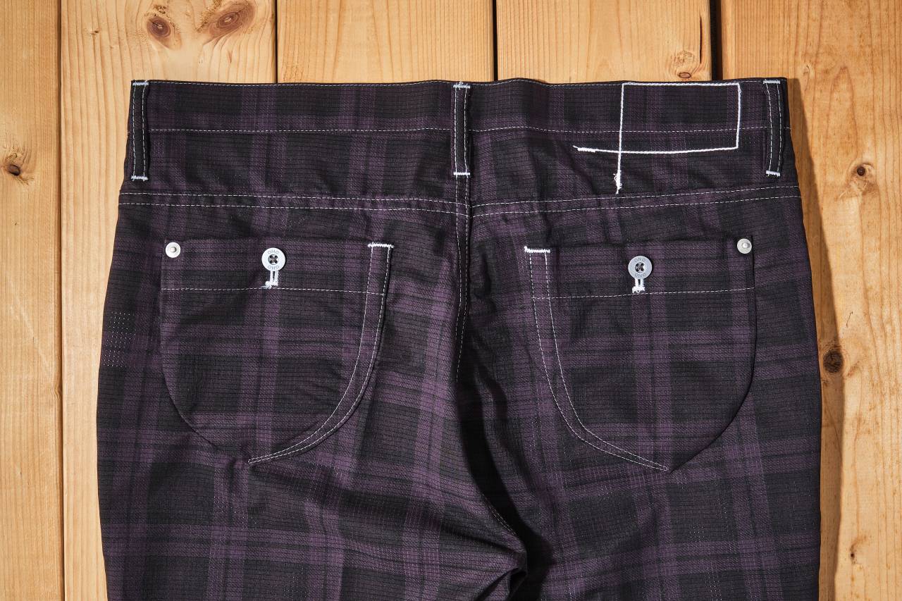 前ポケットは、スラントポケット(スラックス風のポケット)、後ろポケットは脇側のステッチをなくし、内側のステッチを生かしたデザイン。