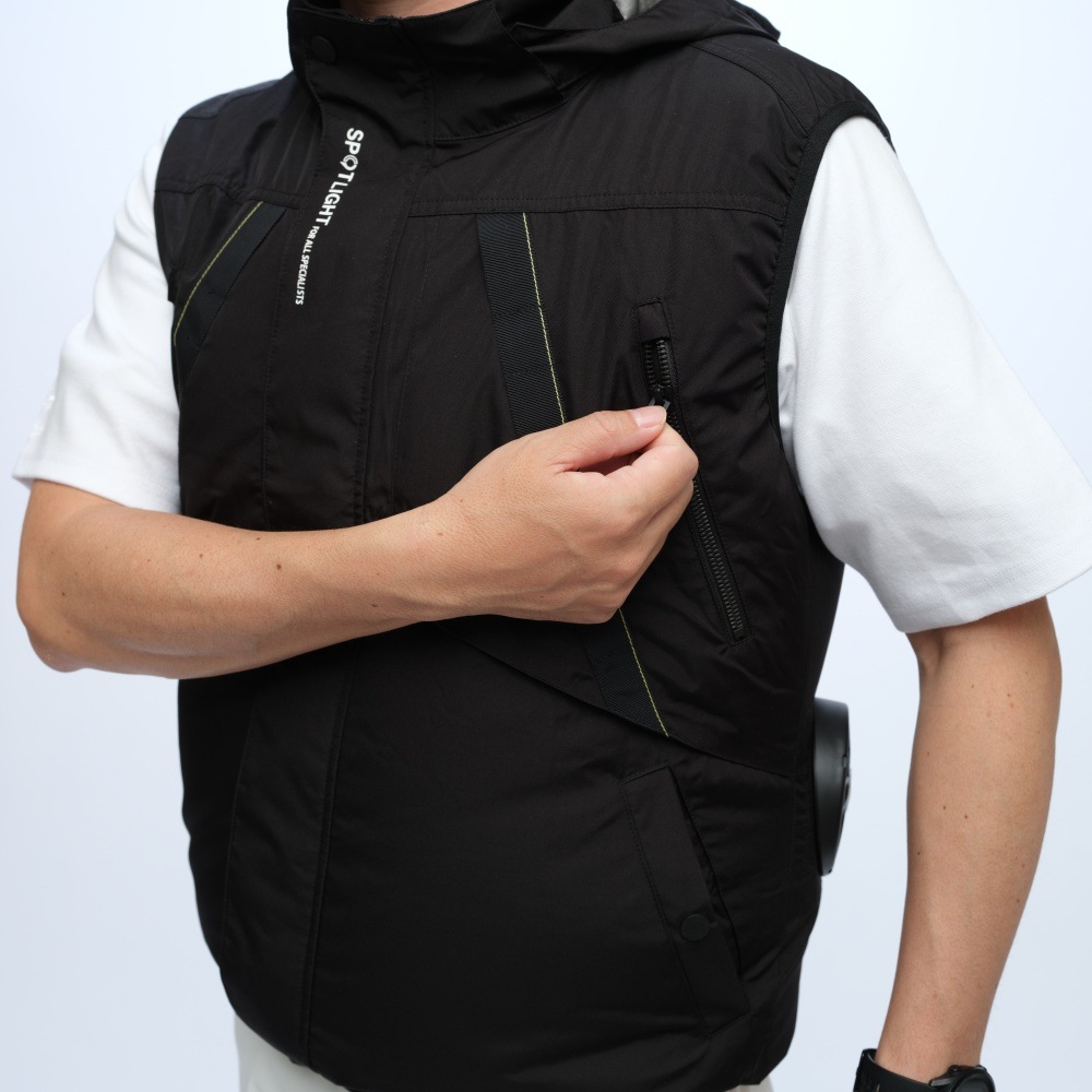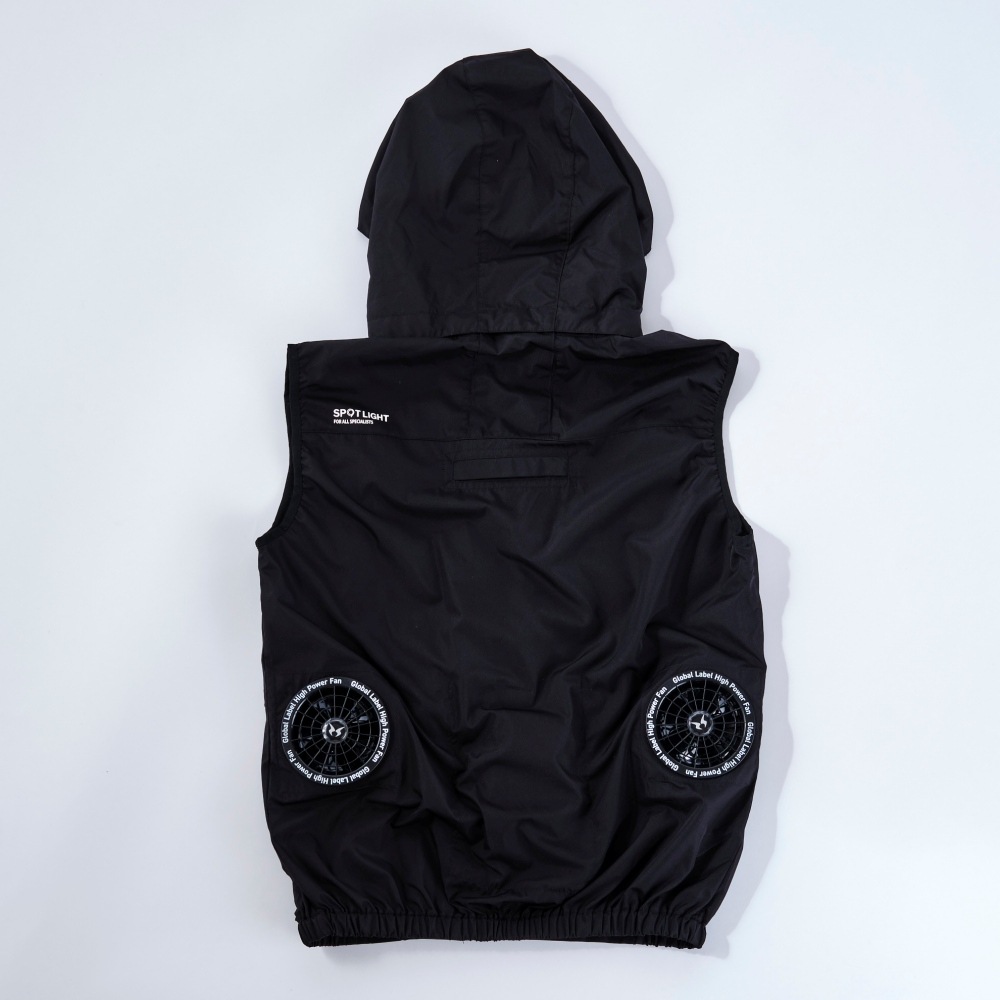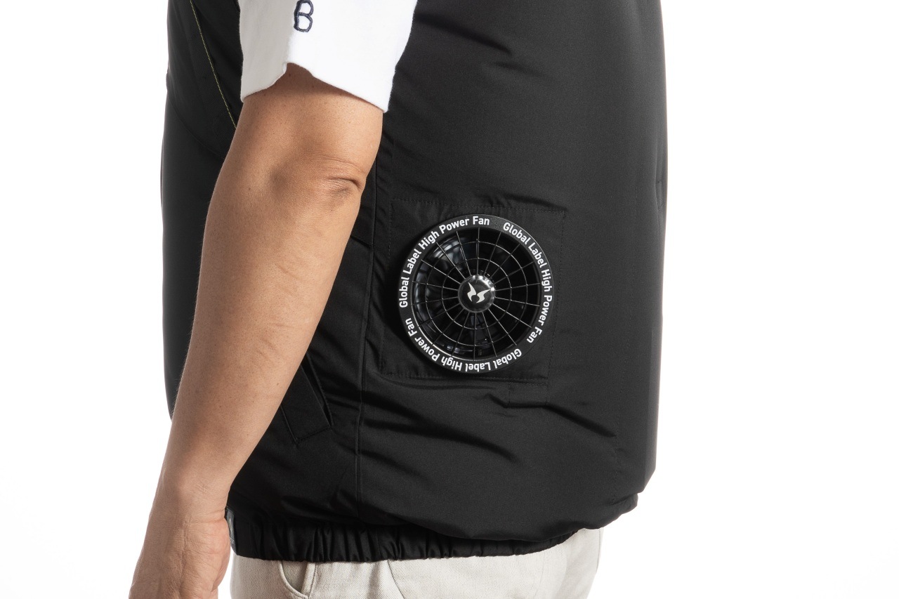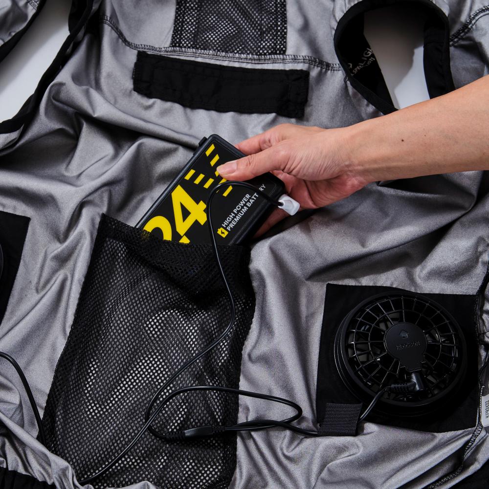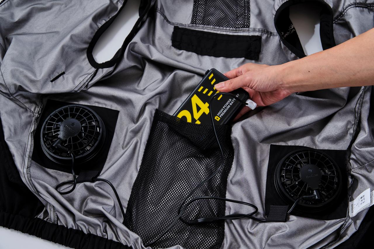 ベスト内側の両サイドまたは背中メッシュポケットに充電したバッテリーを内蔵させ、その両脇にファンを2つ取り付ければ空調風神服®のセッティングが完了です。