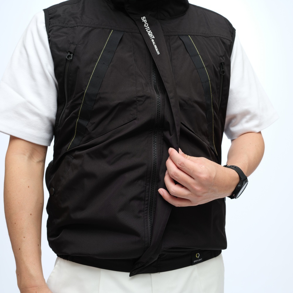 機能性もさることながら、実用的に作られているのもこのベストの特徴です。両胸にはファスナーのマチ付きポケットが施され、スマホやボールやティなどの収納にも便利です。