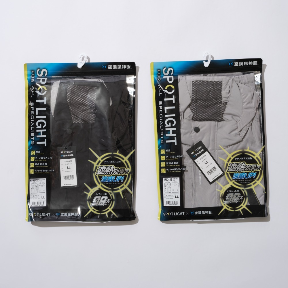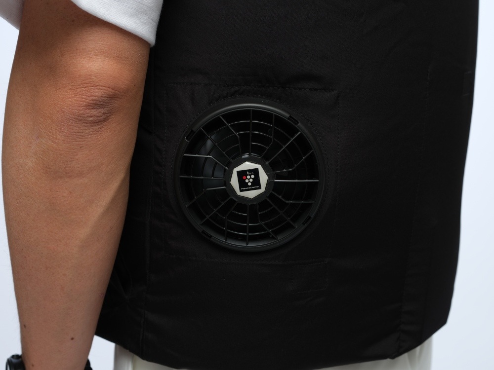 「空調風神服®」とは服に取り付けた小型ファンで、服の中に外気を取り入れ、身体の表面に大量の風を流すことにより、汗を気化させて、涼しく快適に過ごしていただくためのアイテム。