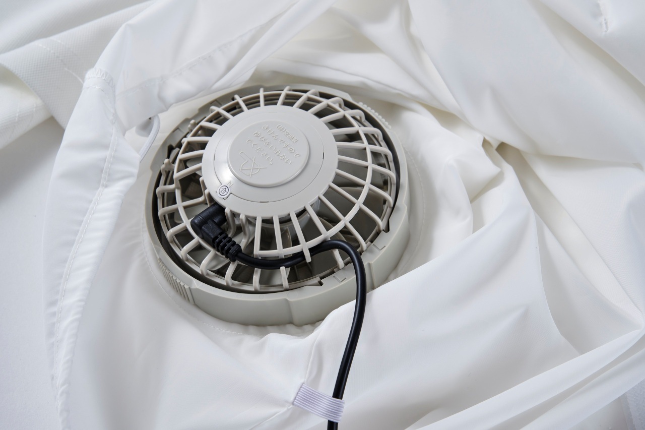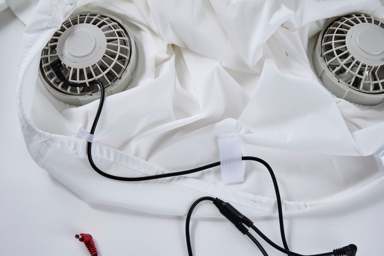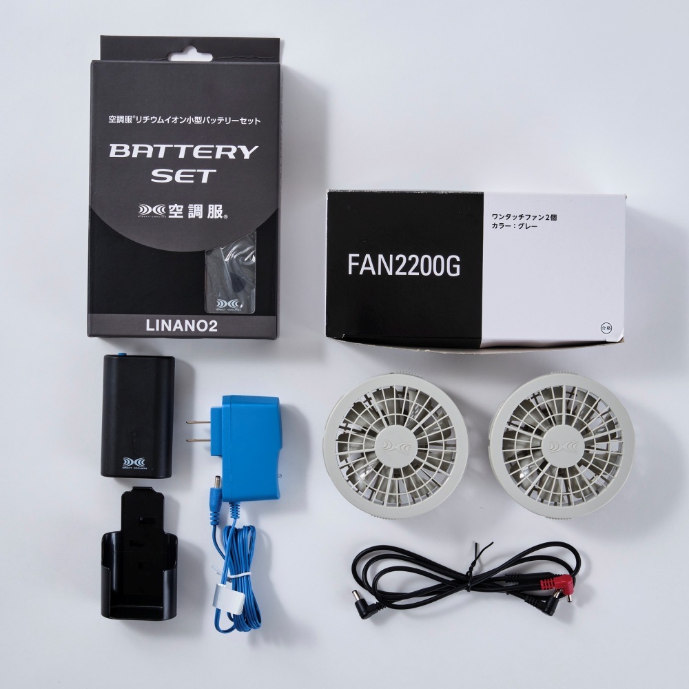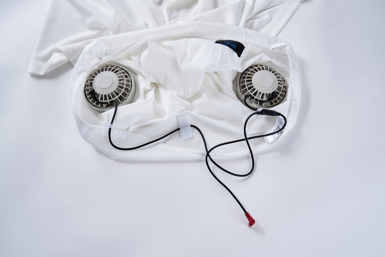 すぐに着用できるファンとバッテリーと充電器、ケーブル、バッテリーホルダーをポロシャツとセットにしてお届けします。