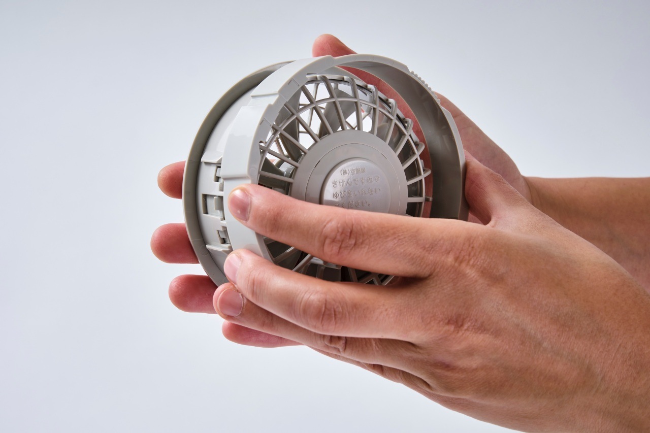 リングで裏から固定するタイプのファン。ワンタッチで取り外しができるので、汗をかいてもこまめに洗濯が可能。