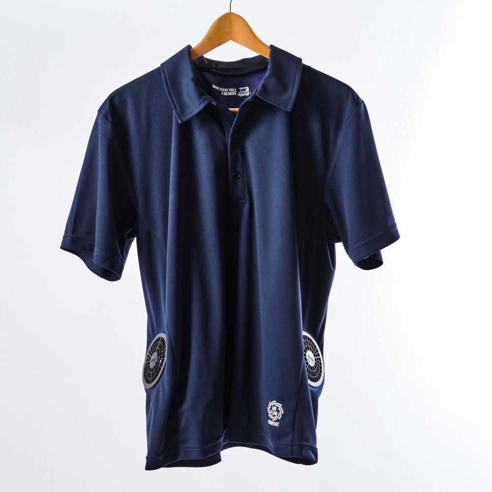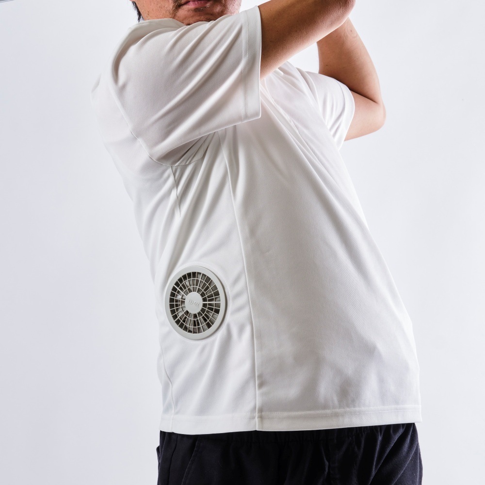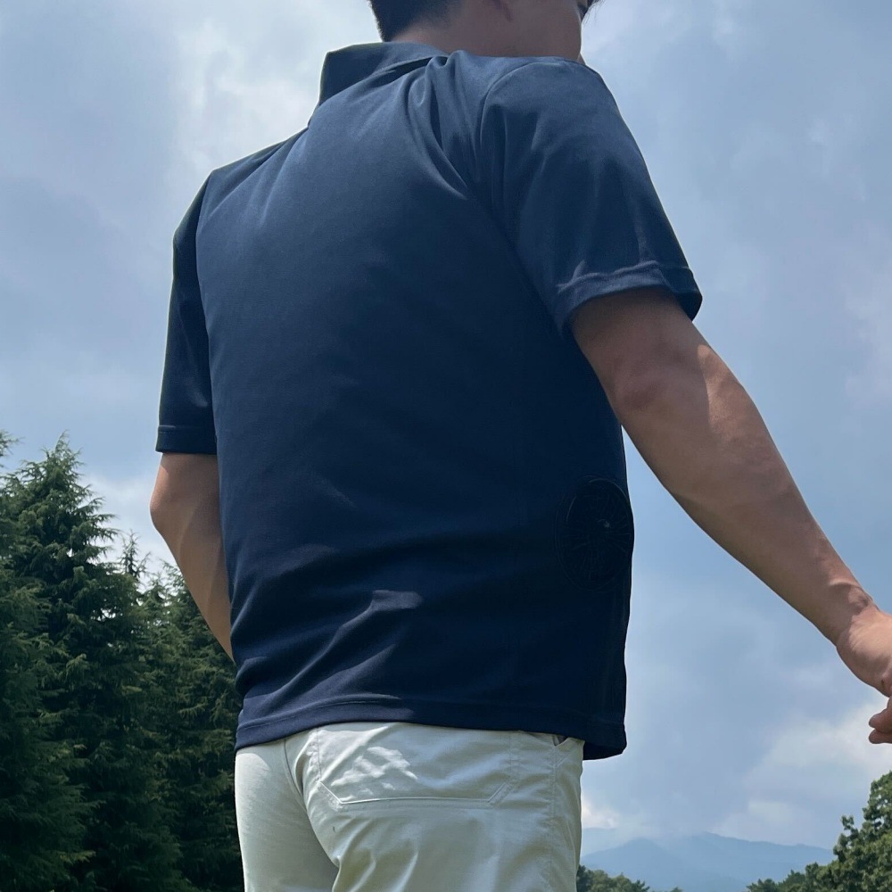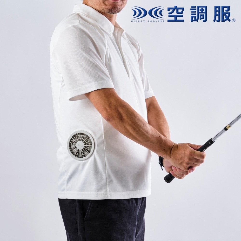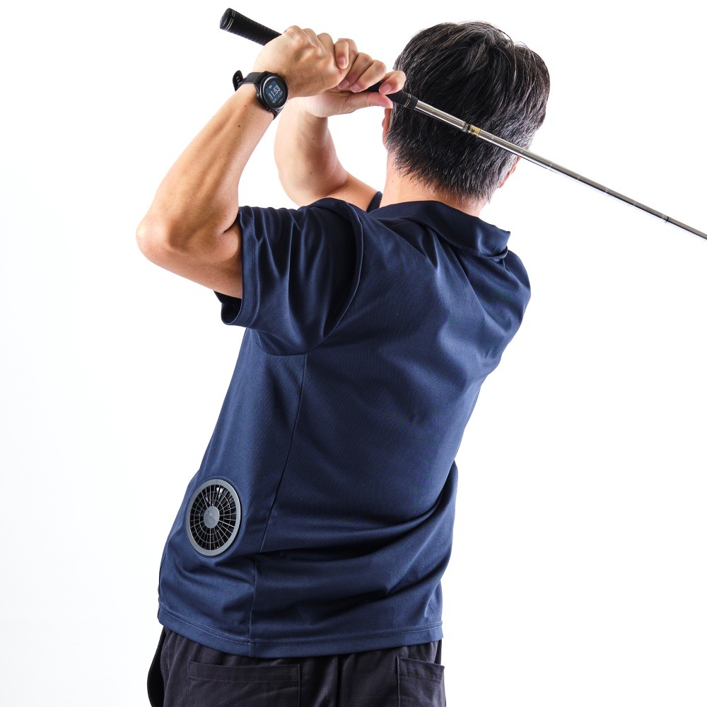 ファン付きベストも涼しいけれど、灼熱のゴルフ場でポロシャツの上にもう一枚ベストを着るのは少々おっくう……そこで、ありそうでなかったゴルフで着られるファン付きポロシャツを作ってもらいました。