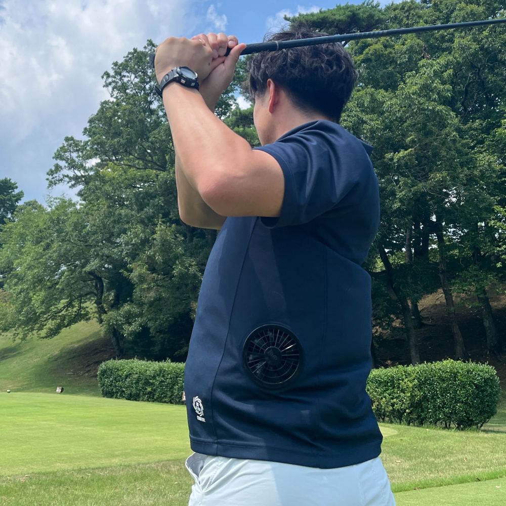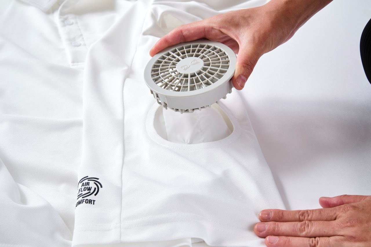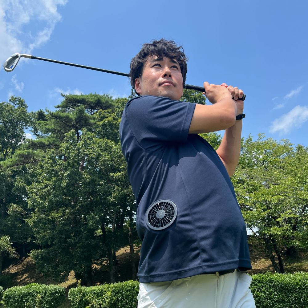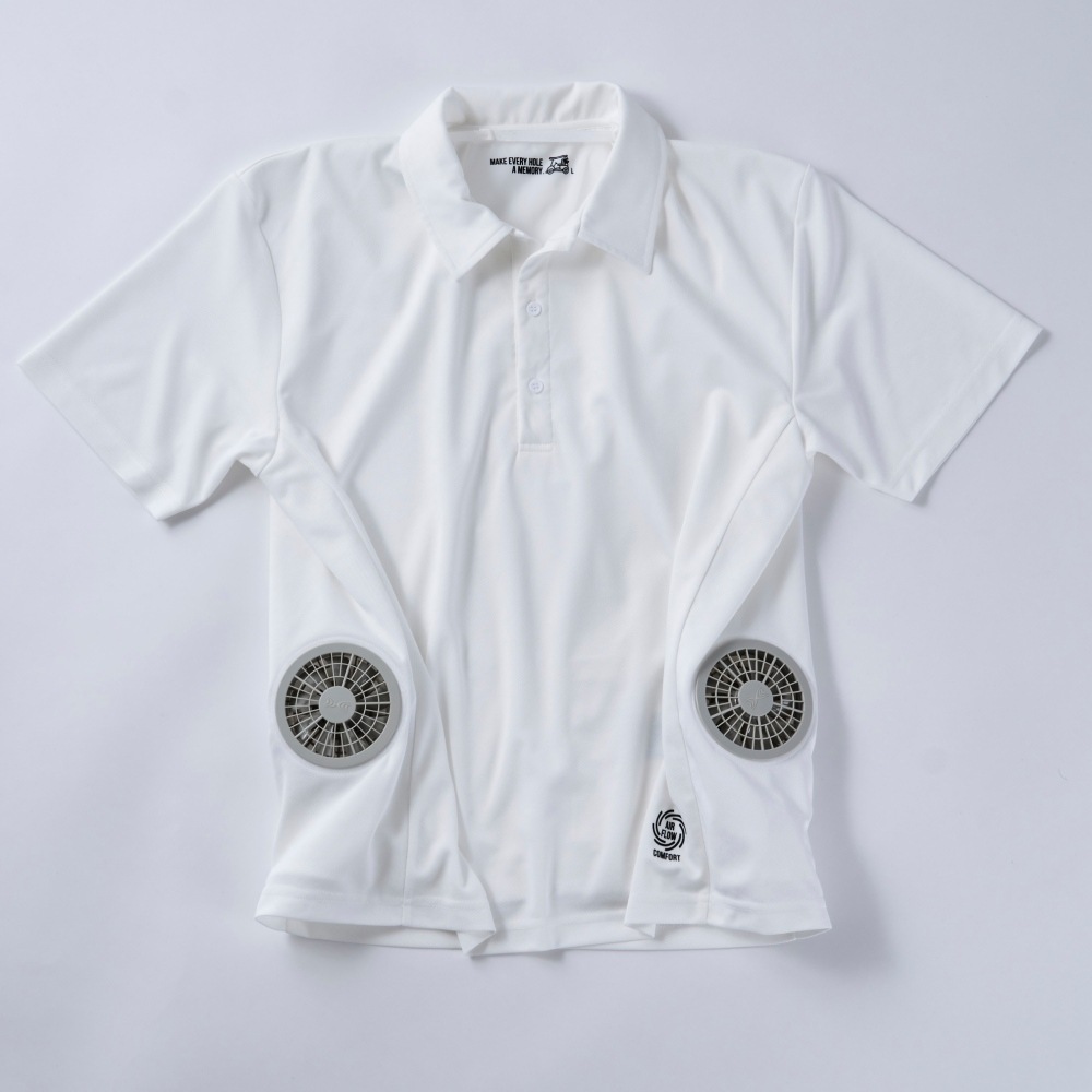 ファン付きベストも涼しいけれど、灼熱のゴルフ場でポロシャツの上にもう一枚ベストを着るのは少々おっくう……そこで、ありそうでなかったゴルフで着られるファン付きポロシャツを作ってもらいました。