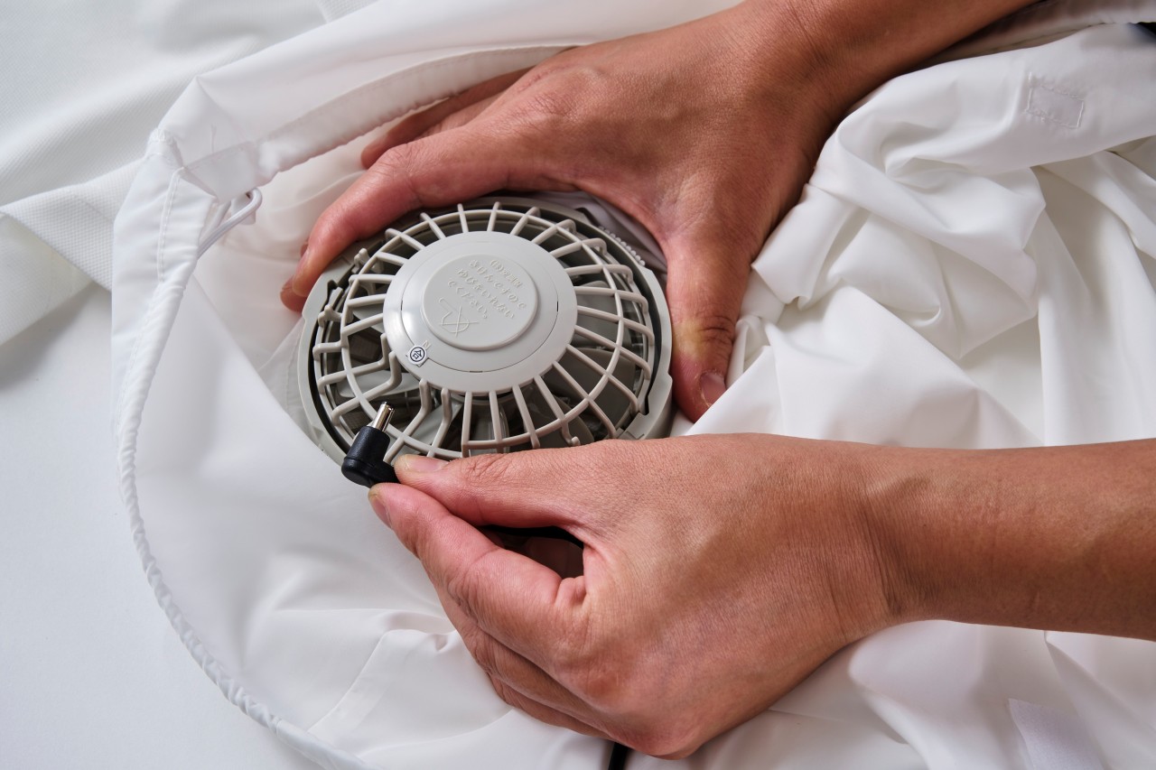 何よりも重視したのはスウィングしたときに邪魔にならない、かつファンがしっかり空気を取り込める位置に設定。バッテリーを脇腹のポケットではなくベルトに付けることができるように、バッテリーホルダーも付属しました。