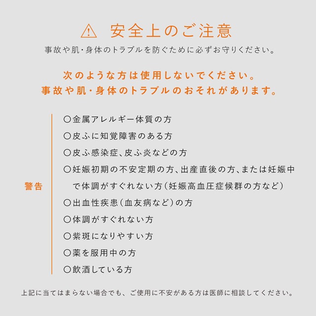 【警告】次のような方は使用しないでください。事故や肌・身体のトラブルのおそれがあります。