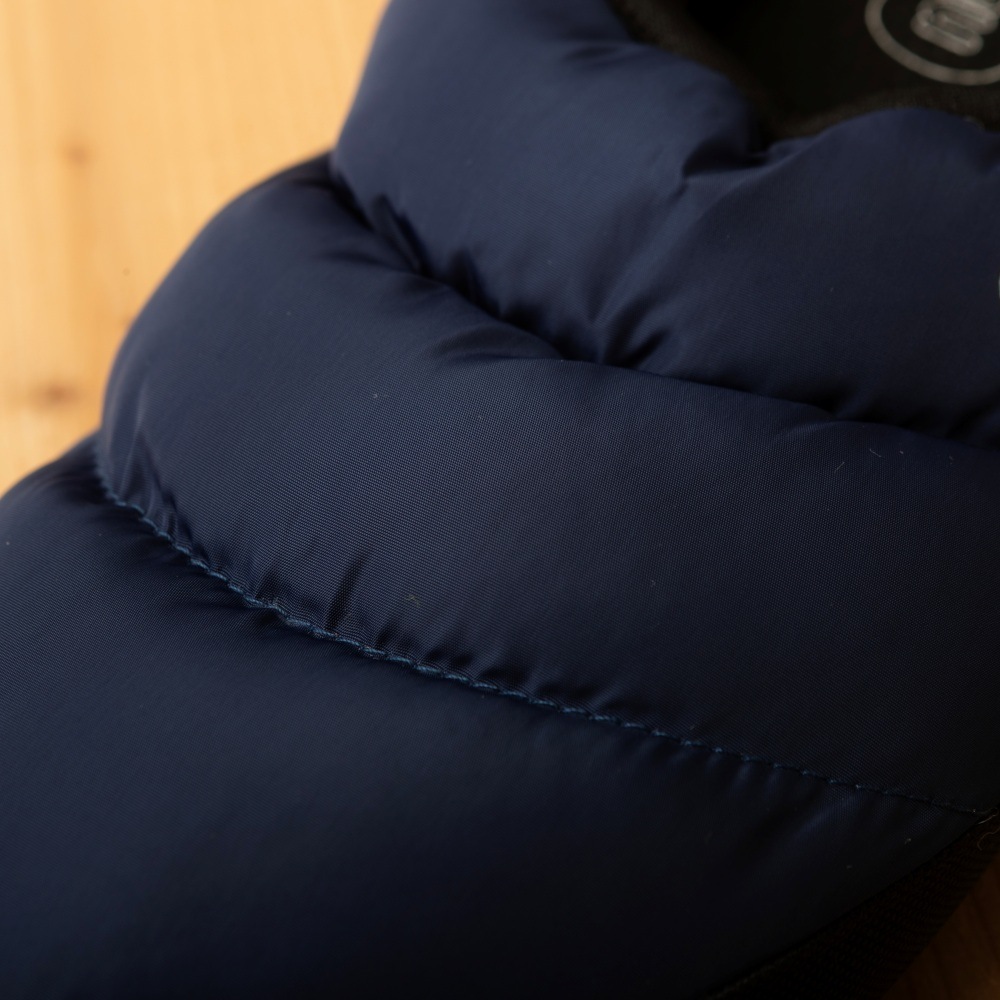 かかと部分を覆うようなデザインに、アッパー部分には中綿ダウン仕様なので通常のスリッパより暖かさが違います。そして素足に履いても気持ちがいい!